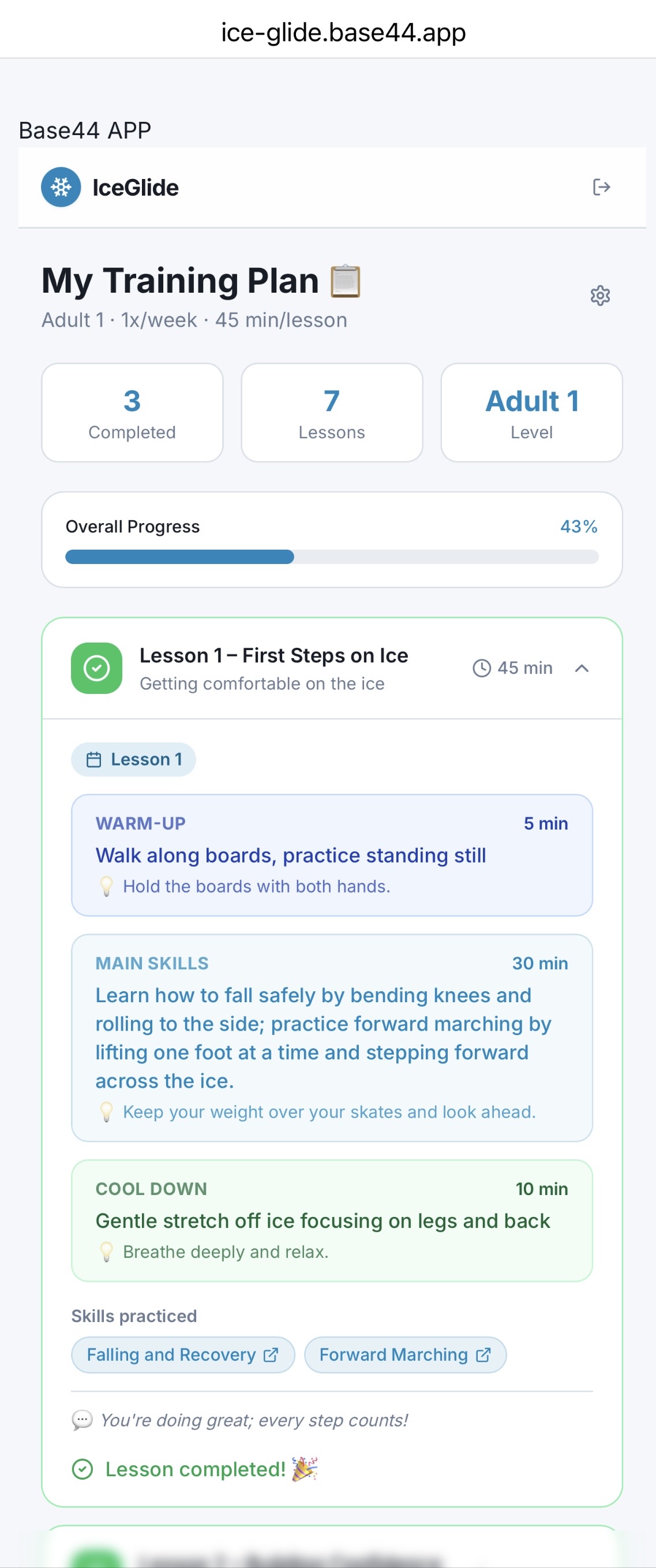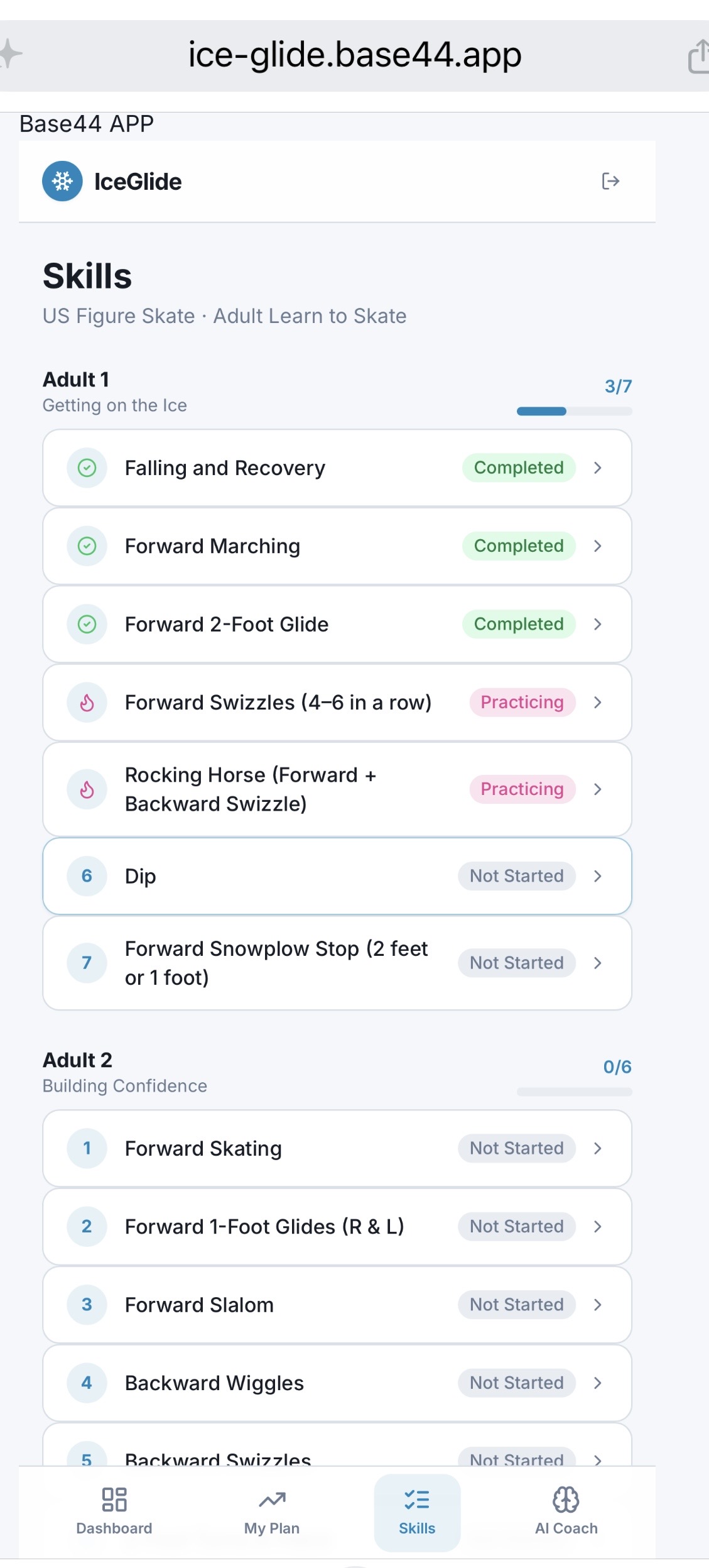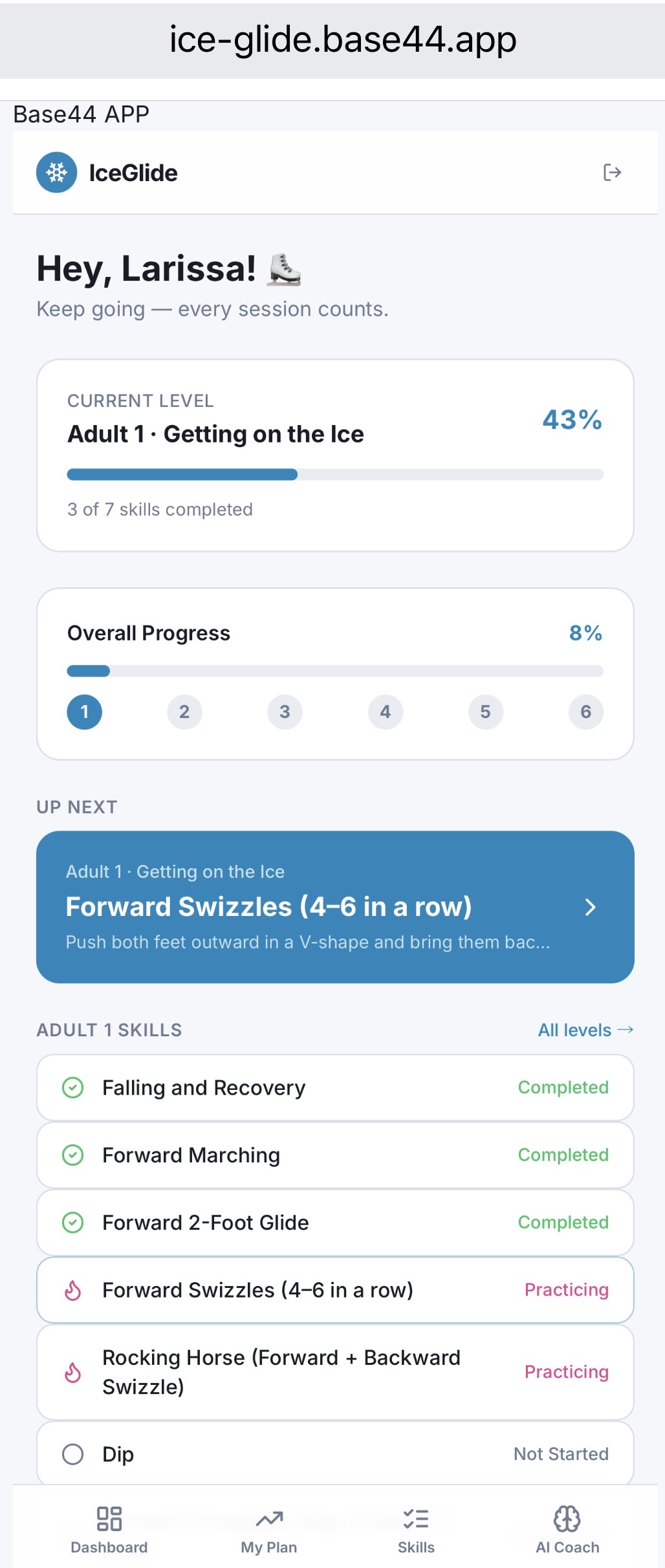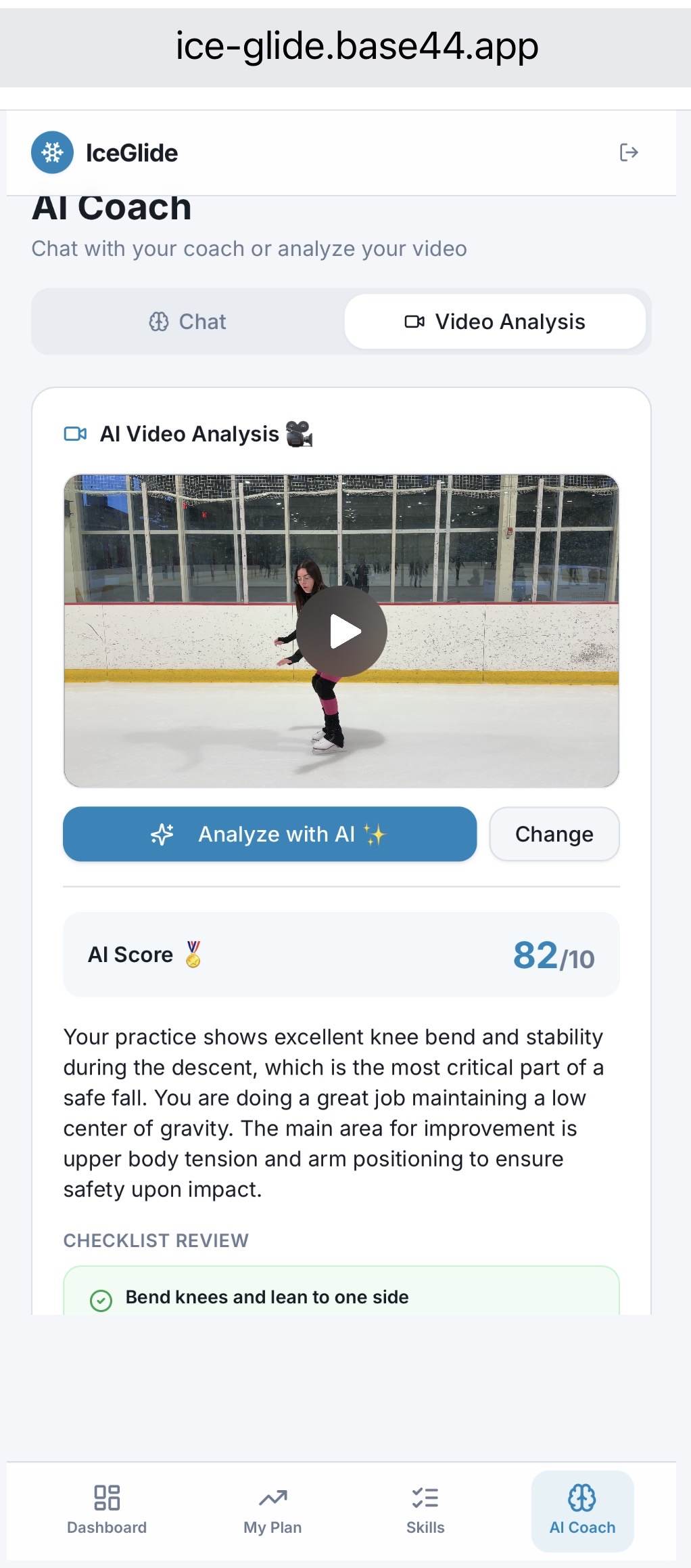 Ice Glide was built using a low-code platform (Base44), focusing on rapid prototyping and iteration. The app combines multiple components into a single experience: -User authentication for personalized access -Structured training plans based on skill progression -Video upload and playback for skill practice -Pose detection (MediaPipe) for video analysis -AI Coach for conversational interaction -ElevenLabs integration for voice-based instructions The goal was to integrate AI features with a clean and intuitive user experience while keeping the application lightweight and responsive.
