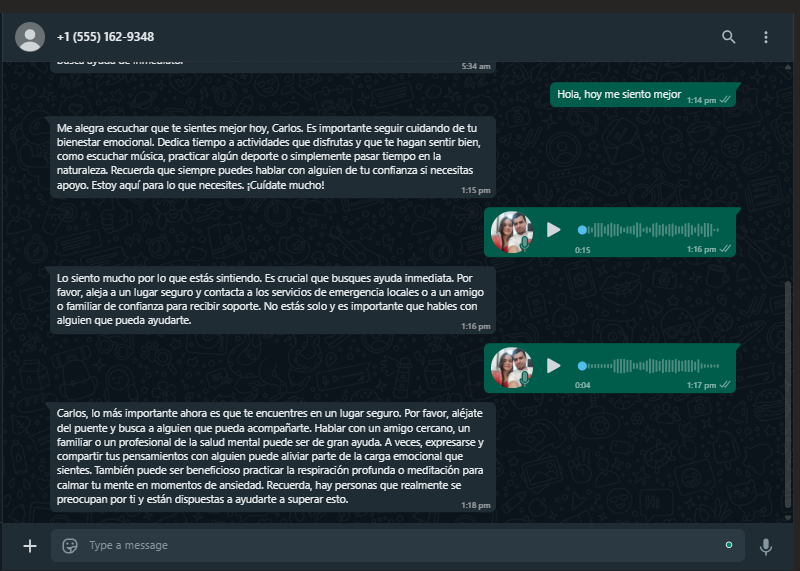 Desarrollamos una integración robusta que interactúa tanto con la API de WhatsApp como con un asistente de OpenAI. Asimismo, utilizamos Flutter para crear un dashboard web que permite analizar en tiempo real los niveles de riesgo de los usuarios que interactúan con el asistente. Para la transcripción de voz, integramos la Whisper API, mientras que el análisis emocional se lleva a cabo mediante modelos NLP personalizados basados en GPT-4-o. Todo el sistema se respalda en Supabase para el manejo seguro y eficiente de datos.
