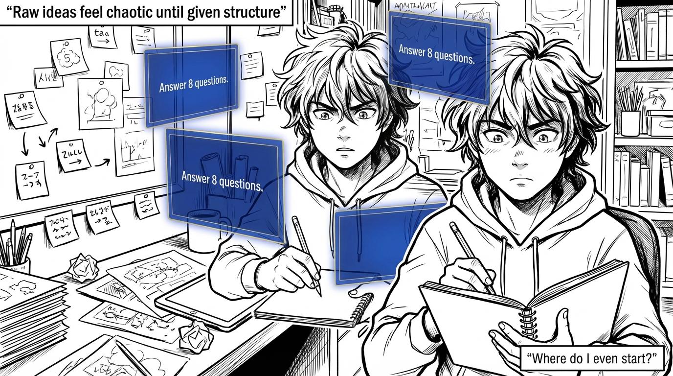 The main challenge was designing a small, fixed set of questions that could apply to a wide range of ideas—apps, sites, systems, and products—while still producing something genuinely useful. The questions had to be broad enough to handle different domains, but specific enough to force real decisions and avoid vague or generic outputs.