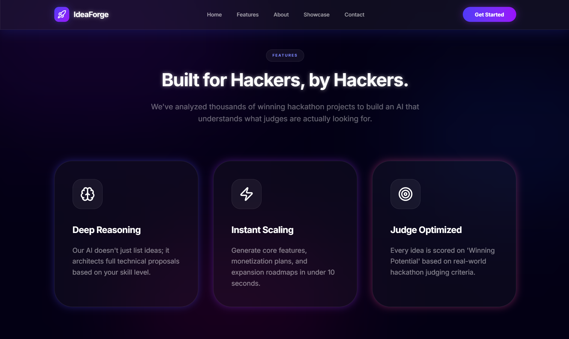 Modern AI-powered landing page showcasing IdeaForge’s mission to architect winning hackathon projects.