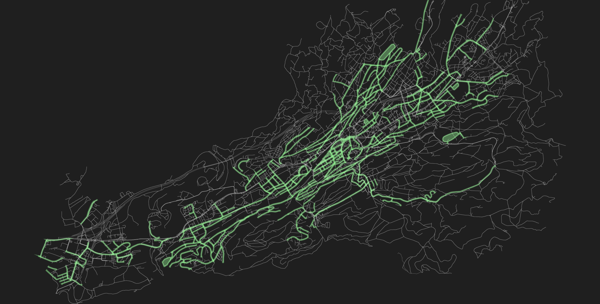 Aufbereitung und Berechnung von Geodaten, Einbezug externen Quellen (OSM) und Kombinieren von verschiedenen Datensätzen. Schöne Darstellung.