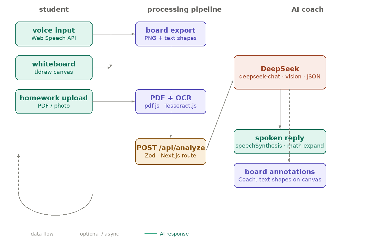CoachBoard is a voice-driven AI math tutor built around an interactive whiteboard. Students draw problems, write equations, or upload homework (PDF or photo), then simply talk. The coach listens, sees the board, reads the homework, and responds in natural spoken language, just like a human tutor would.