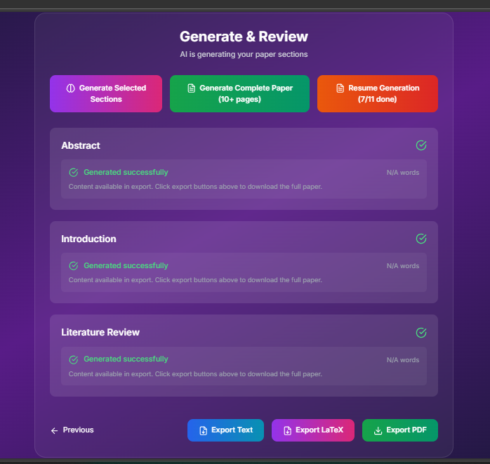 In the future, we plan to add semantic plagiarism and similarity analysis against larger academic datasets, support multiple journal and conference templates, enable multi-author collaboration, and provide editable DOCX and LaTeX exports. We also aim to enhance model flexibility by supporting newer Gemini models and improving citation and reference automation to further assist researchers.