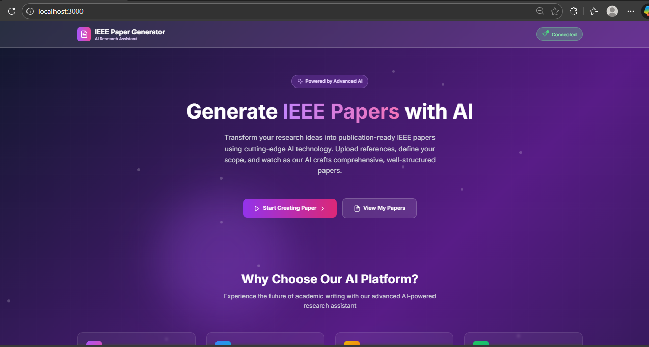 Writing an IEEE research paper is often more difficult than the research itself. We observed that students and early researchers spend weeks struggling with strict IEEE formatting, structuring sections, consolidating multiple review papers, and fixing LaTeX errors. While existing AI tools can generate text, they fail to follow IEEE standards and often produce ungrounded or hallucinated content. This gap inspired us to build a system that uses AI responsibly to assist research writing while maintaining academic structure and integrity.