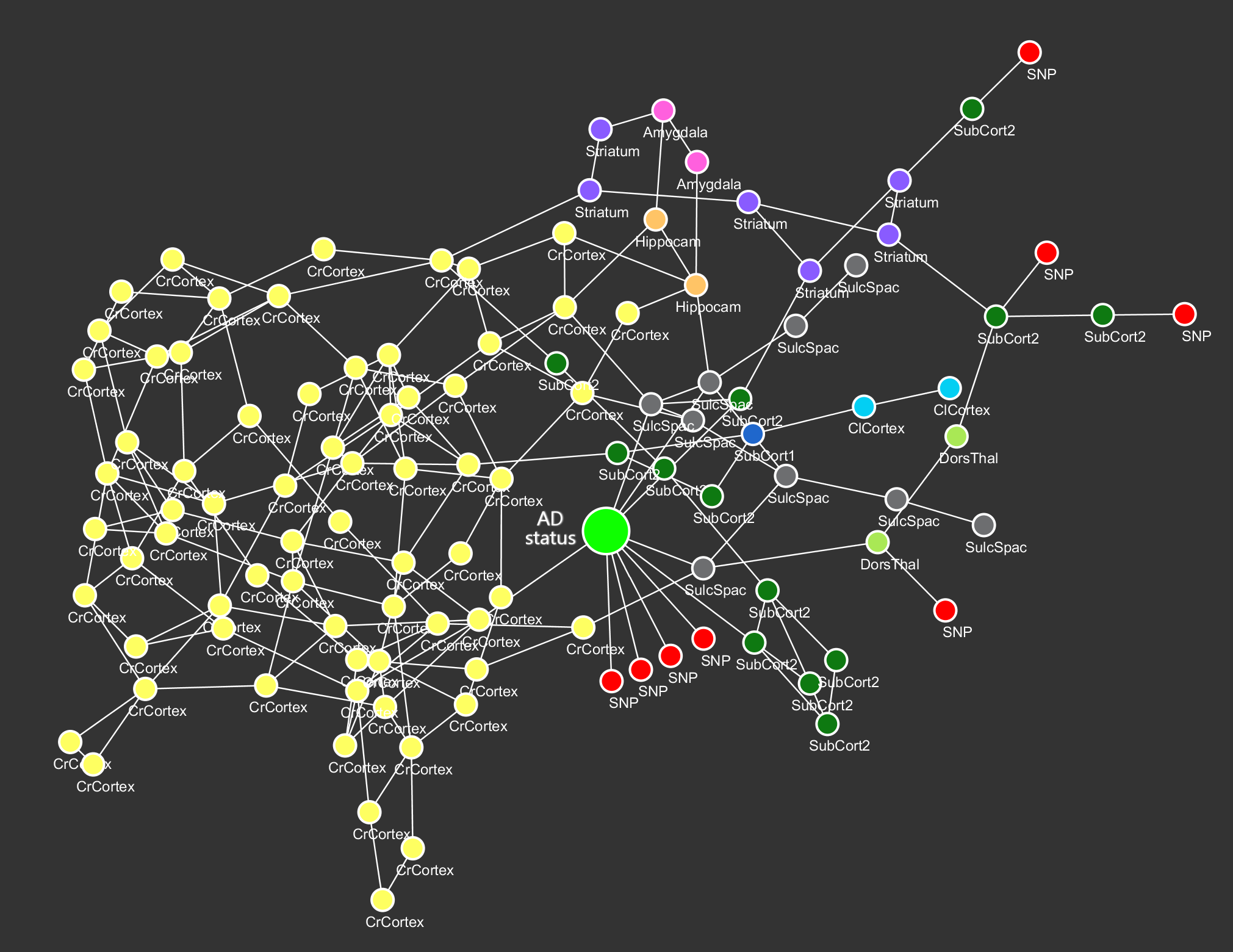 Alzheimer's disease is the main cause of dementia in elderly people, and it has a strong genetic component. The disease is characterised by short-term memory loss and a shrinkage of several brain areas (see Figure 1). Despite extensive research into this neurodegenerative disease, the biological causes remain elusive. We set out to find the relationships between known genetic causes, shrinkage of brain areas, and disease status.