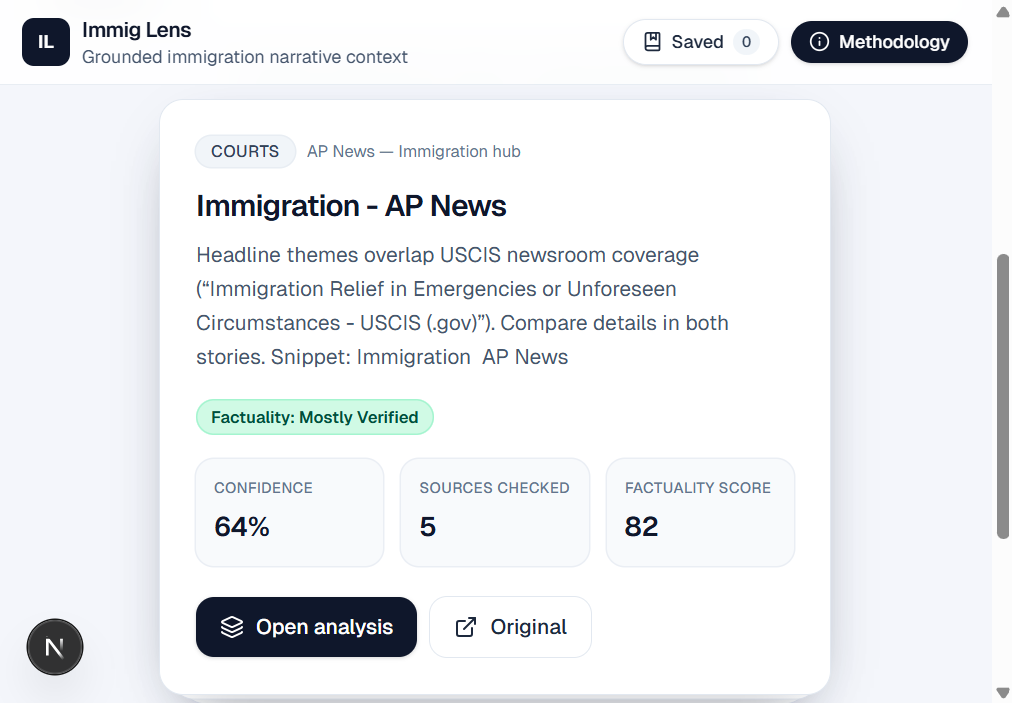 ImmigLens is a card-based reader for immigration news: you swipe (or scroll) through headlines, open a card for depth, and see what the story claims, how that lines up with primary and research sources, and how framing and missing context shape the takeaway. You can also paste an article URL so the same pipeline runs on a story you care about.
