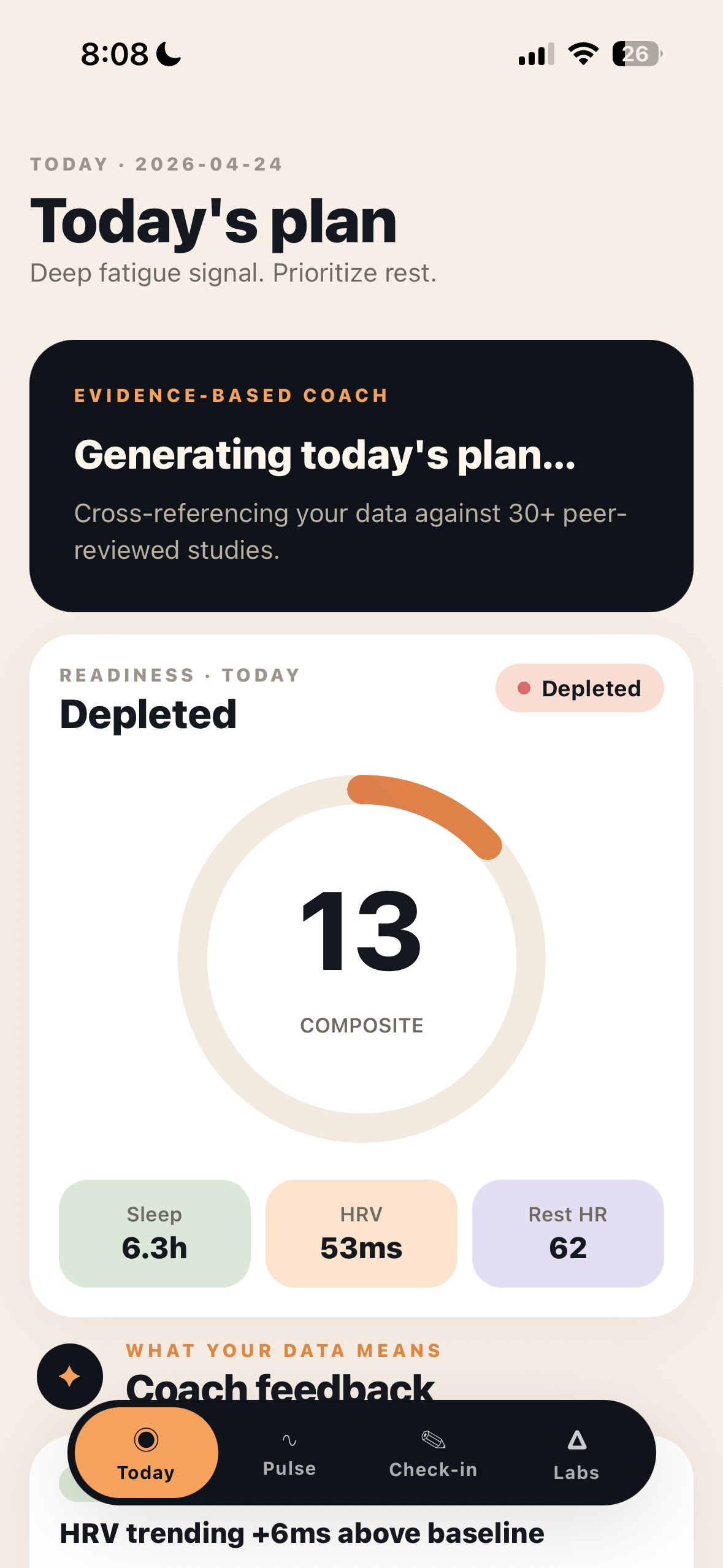 The standout feature is self-experiments: you can propose hypotheses (e.g., "does cutting caffeine after 2pm improve my HRV?"), and the system automatically tracks pre/post metrics, computes effect sizes, and evaluates whether the intervention actually worked. An adaptive check-in system asks different questions based on what anomalies are detected — no generic surveys. An LLM-powered coach (Gemini 2.5 Flash) synthesizes all of this into personalized, conversational guidance.