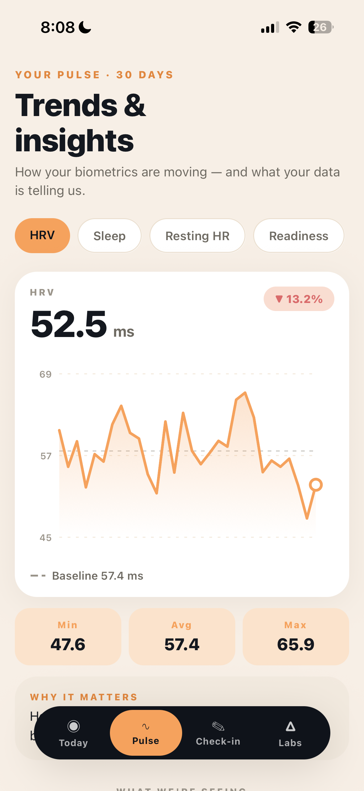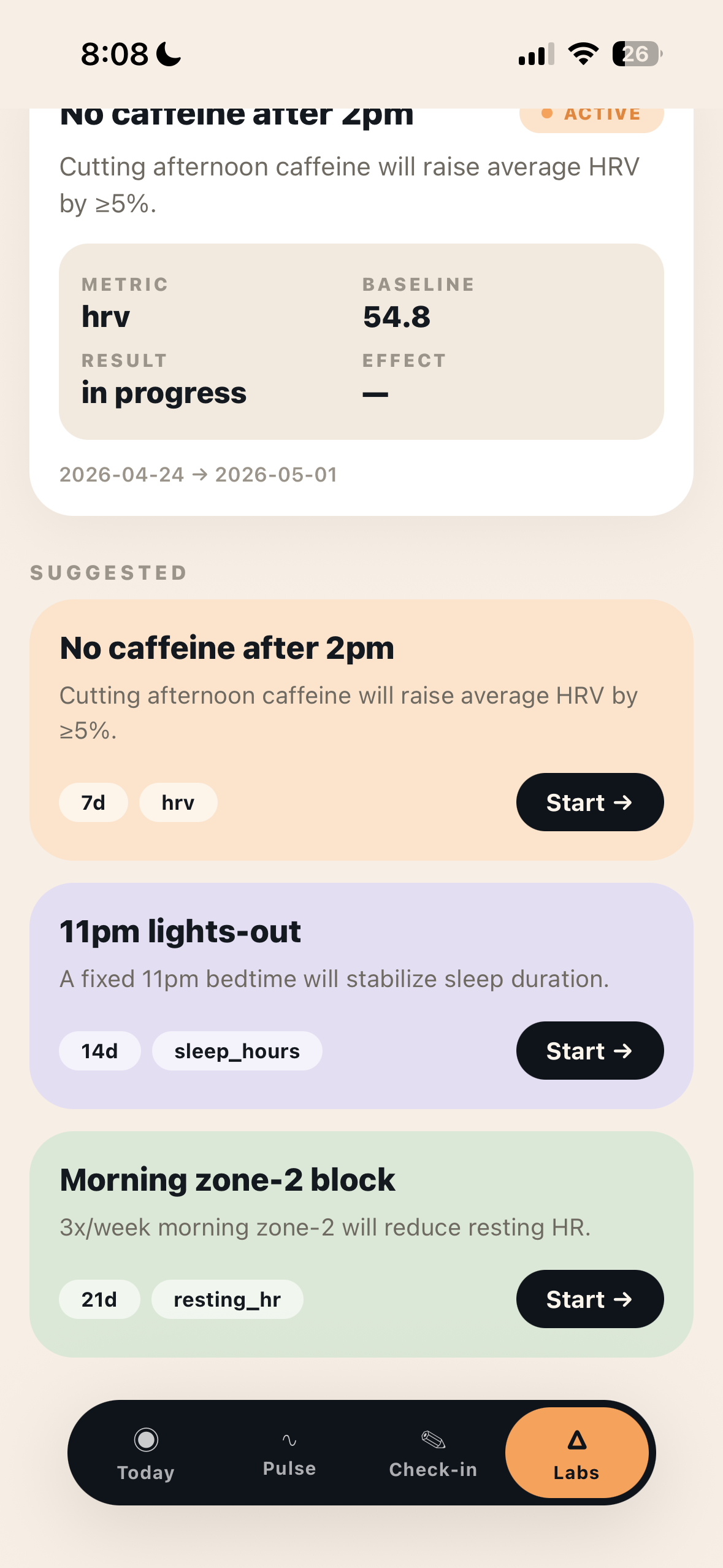 We were frustrated that wearables collect mountains of health data but do almost nothing useful with it. Your Apple Watch knows your HRV dropped 20% this week — but it won't tell you why, won't suggest what to change, and definitely won't help you run a self-experiment to figure it out. We wanted to build the "operating system" for personal longevity: something that actually closes the loop between data collection, pattern detection, and actionable behavior change — all grounded in peer-reviewed science, not vibes.