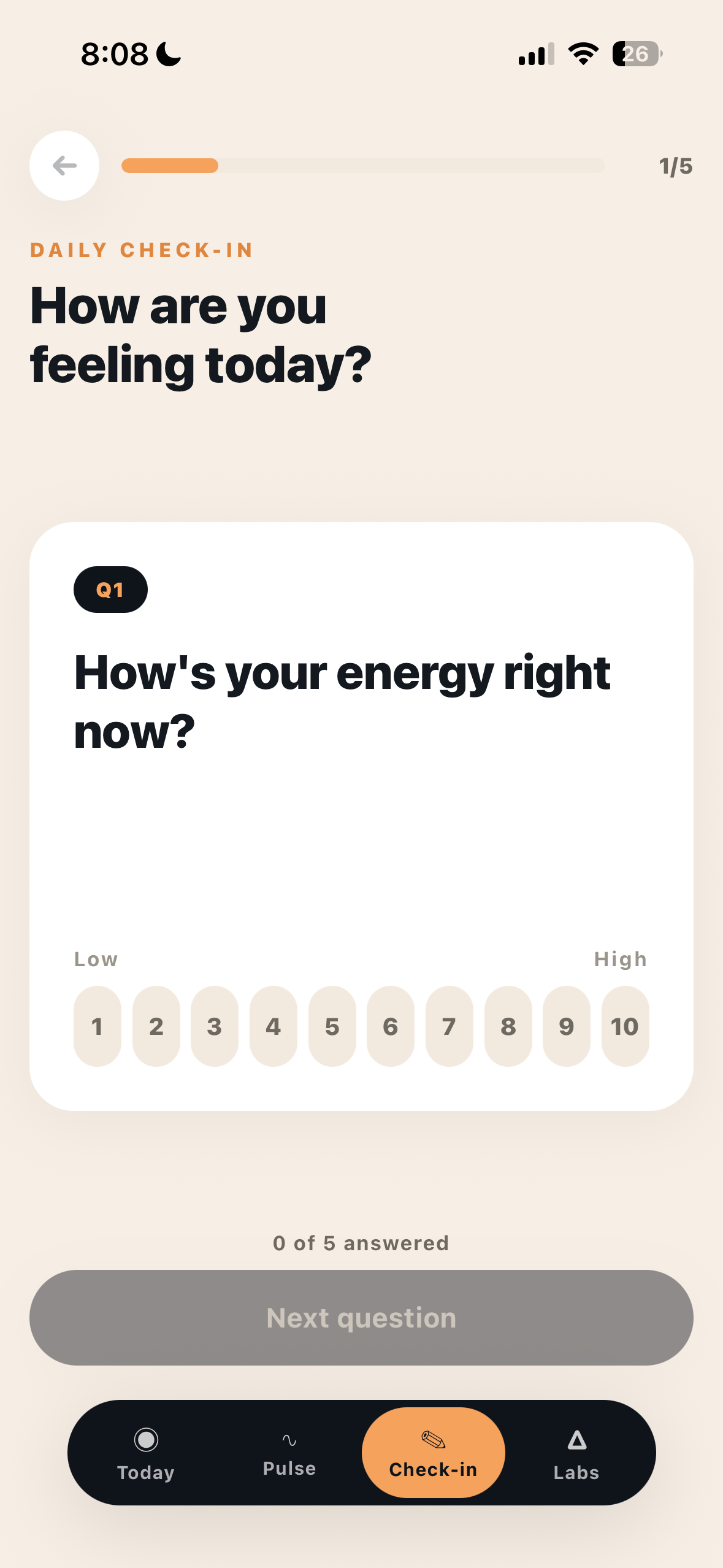 - The adaptive check-in system. Questions change based on detected patterns — if you're showing signs of overreaching, it asks about training load and recovery, not generic mood questions.