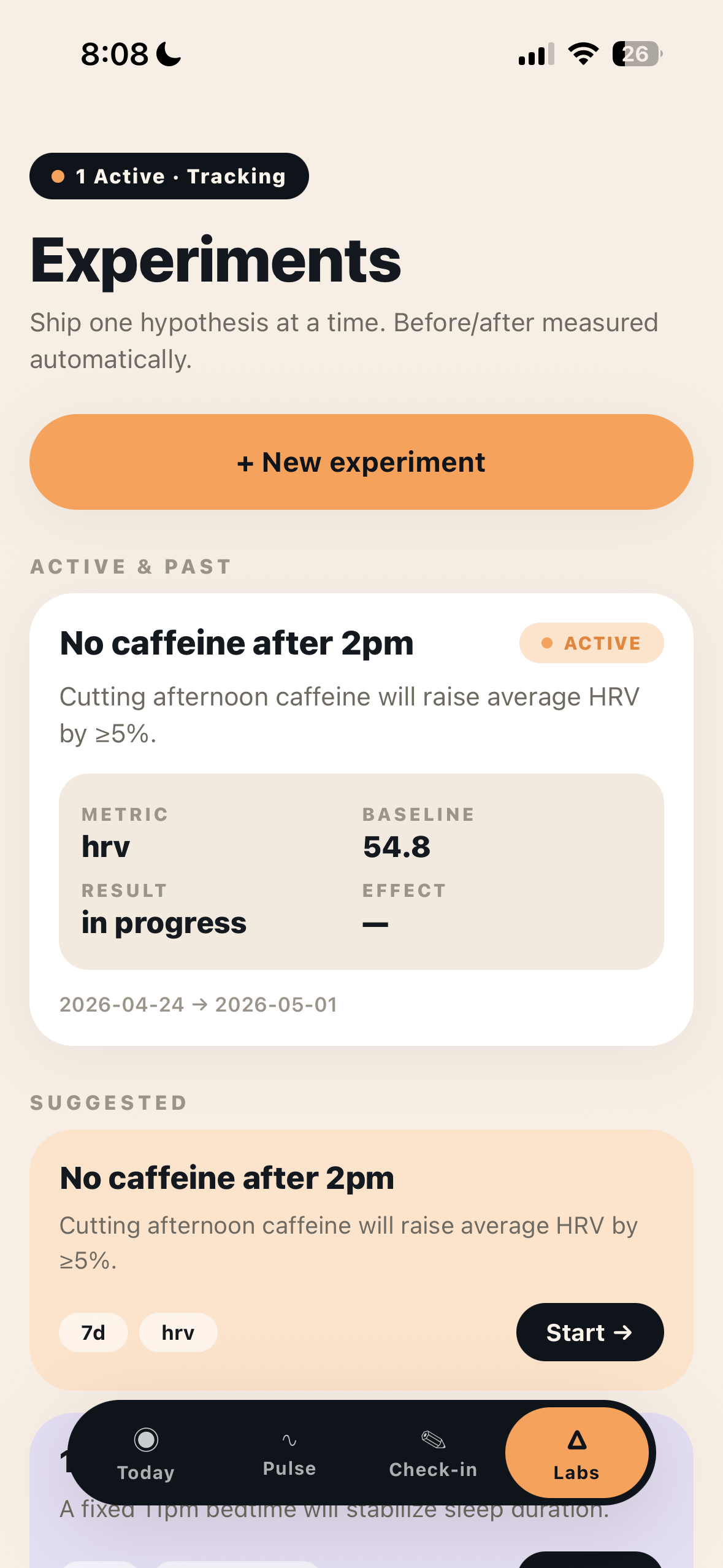 - Self-experiments actually work. Users can propose, run, and auto-evaluate personal health experiments with real effect-size computation. We haven't seen this in consumer health apps.
