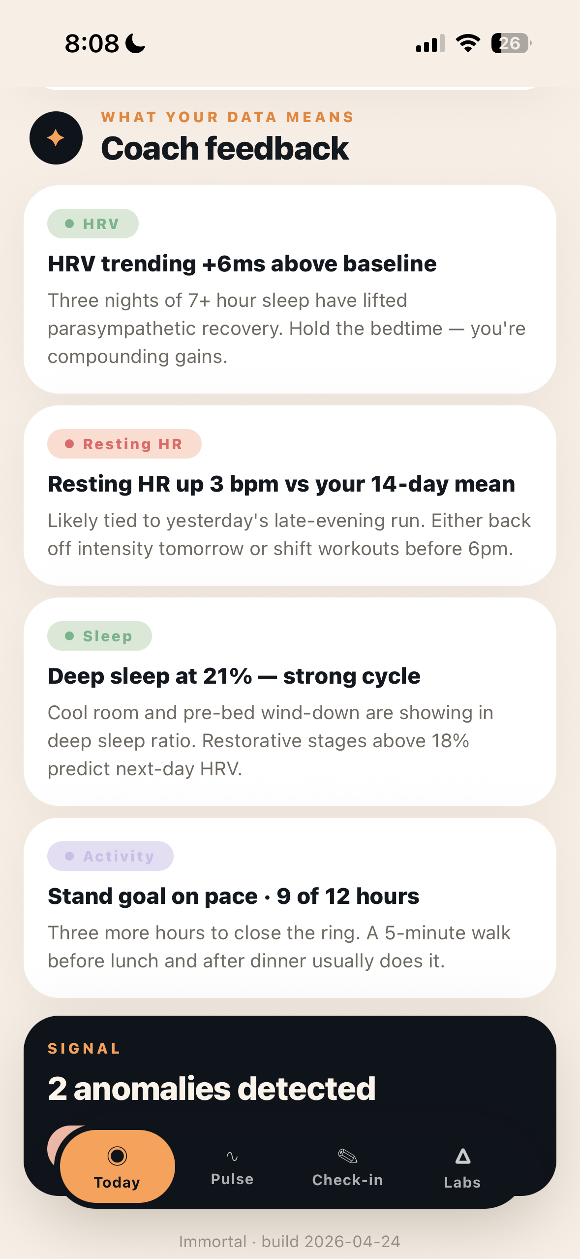 Immortal is a closed-loop personal health intelligence system. It syncs wearable data from Apple HealthKit (HRV, sleep, resting heart rate, steps, workouts), learns your individual baselines over 7/30/90-day windows, and detects anomalies using z-score analysis. When it spots something — like a sustained HRV dip or creeping resting heart rate — it generates evidence-based recommendations ranked by confidence, with citations to the underlying research.