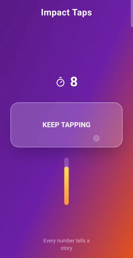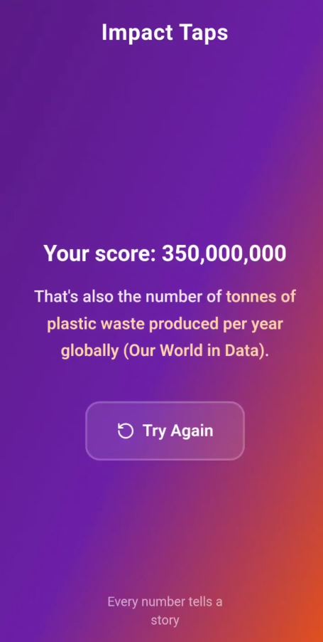 I wanted to build something minimal yet powerful — a short, punchy experience that disguises a sobering reality inside a fun-looking interaction. Something that would trick your brain into paying attention… before revealing a truth you didn’t expect. That’s how “Impact Taps” was born.