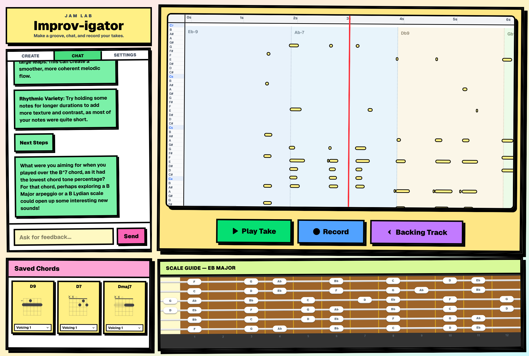 The user can record themselves improvising over the backing track, which will be analyzed by an AI agent for qualities such as melodic contour, how cohesive the melody is, and if the notes were played in the correct scale or not and will provide personalized feedback and suggestions for improvement. The AI chat can also show chord diagrams to be saved for reference while improvising and can modify the generated backing track as needed.