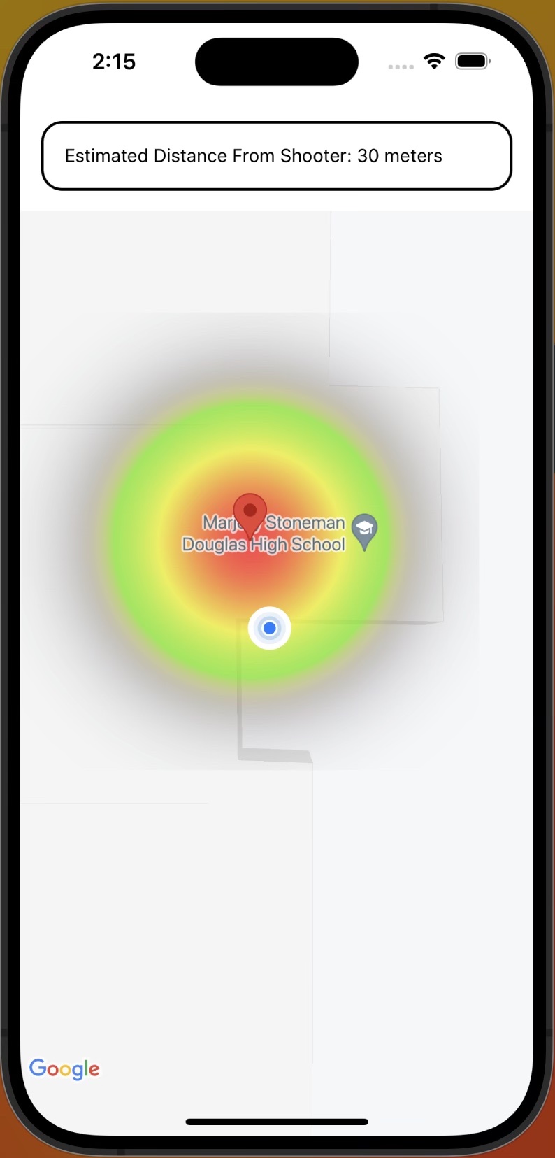 After an emergency is triggered, the app displays the calculated shooter location in real-time