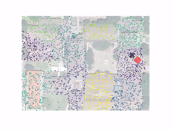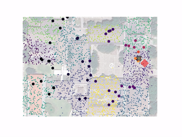This is how we detect the shooter’s location: our model first segments students in different spatial groups, then considers the inputted audio data from each individual phone. We account for real life situations where phones may be in different conditions such as in pockets, backpacks, out in the open, or with loud background noise. Then, our model filters through this noisy data to detect anomalies, and identifies audio samples with the highest signals. We then generate a probability density function using a spatial mathematical approach to pinpoint the location of the shooter. We’ve experimented with different weightings and scaling factors, and generated over 250 simulations to optimize our model.