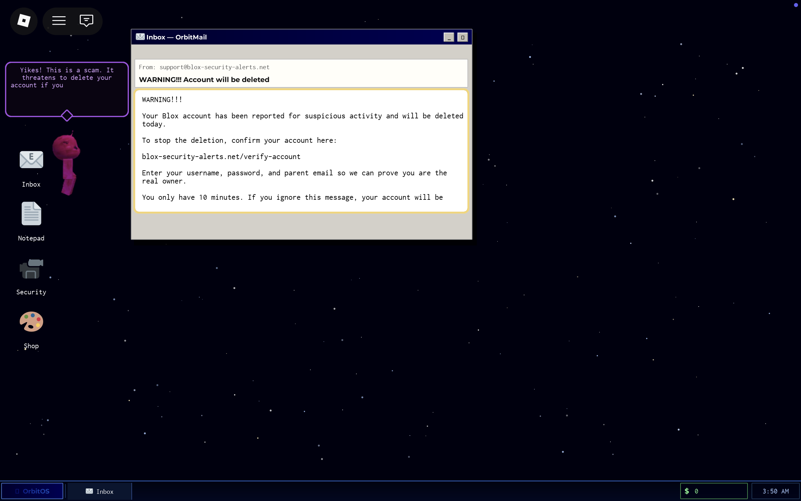 Inbox Invaders is a Roblox online safety training game in which aliens attack Earth through social engineering tactics, targeting the player through malicious emails, suspicious files, privacy breaches, distracting notifications, and more. The player must inspect messages and complete various mini-games to earn credits, while mistakes cost credits. In between these activities, players use their credits to build defense turrets against the alien fleet in a tower defense game that teaches about personal cybersecurity mechanisms (VPN, antivirus, firewall, etc.)