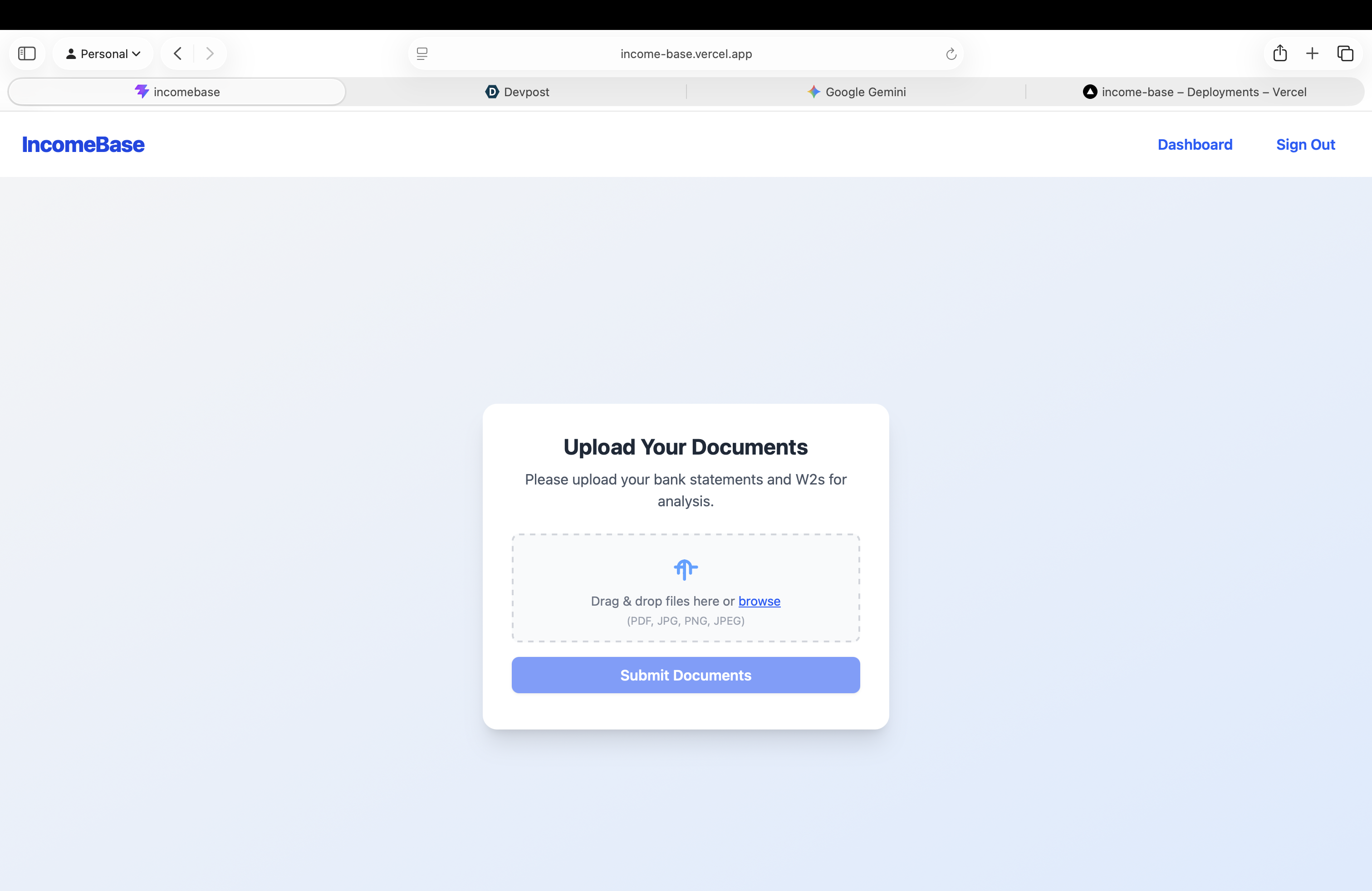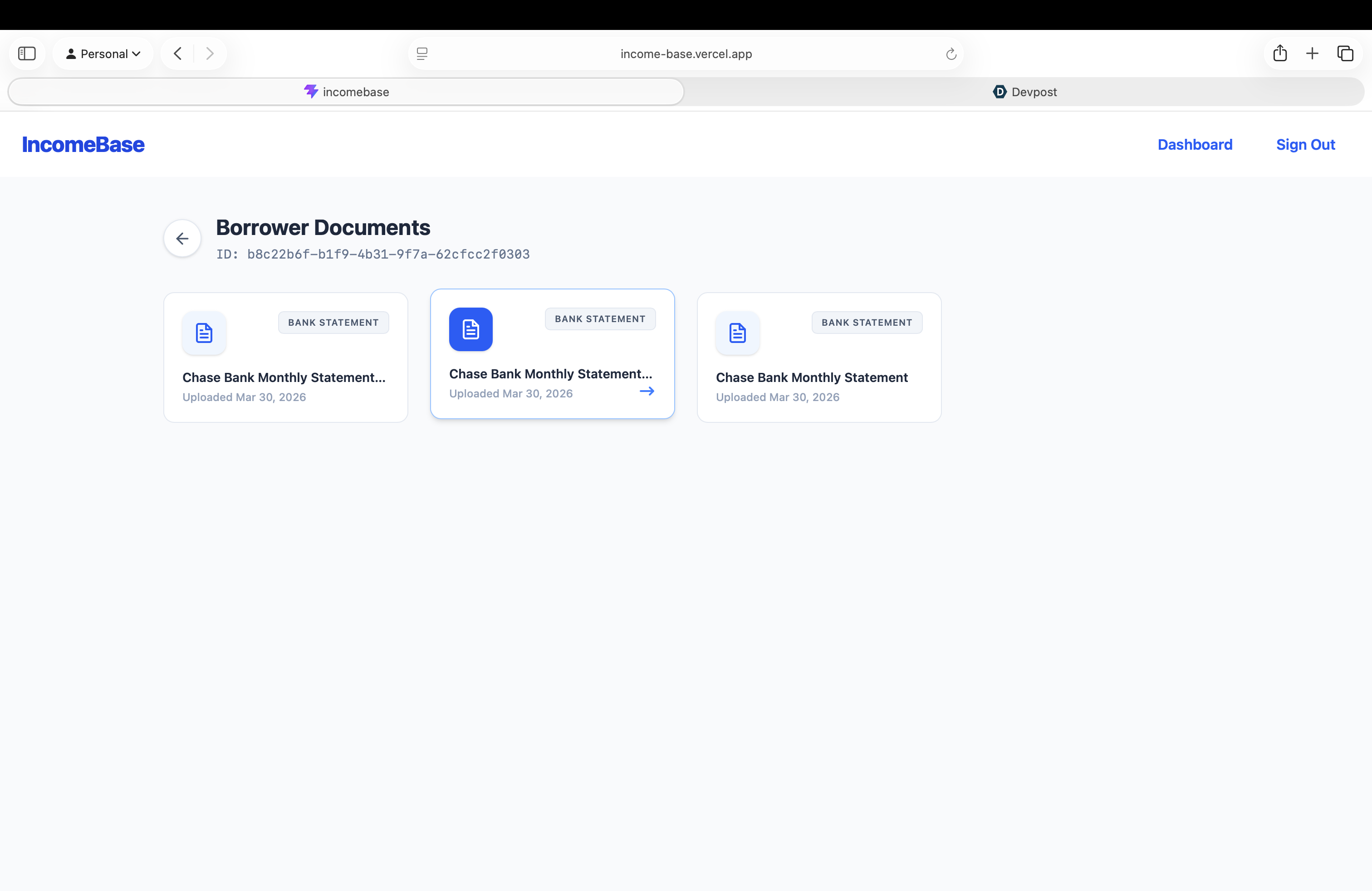 Borrowers have to hunt down fragmented tax returns, bank statements, and 1099s. Underwriters then spend hours manually staring at messy PDFs, trying to reconstruct complex income streams. It's a slow, inconsistent, and highly error-prone process. We realized that with recent advancements in AI and document parsing, we could completely automate the most painful part of loan origination. That's why we built IncomeBase.