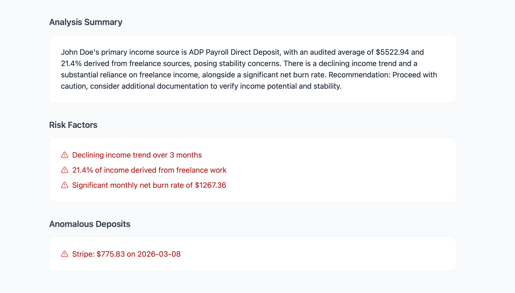 Instead of manual math, our AI calculates complex underwriting metrics on the fly, such as the monthly qualifying income: