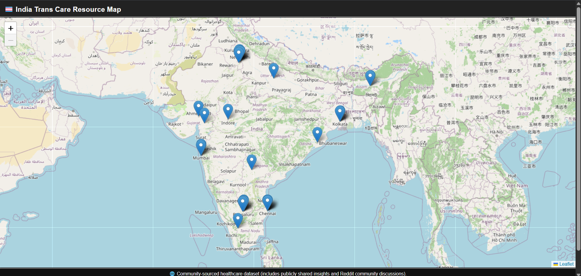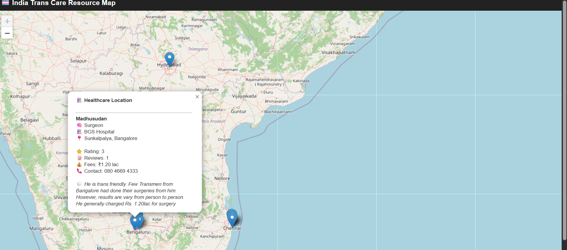 India Trans Care Resource Map is an interactive web-based map that helps users find trans-friendly healthcare providers across India. It displays doctors and clinics with details such as specialization, hospital affiliation, fees, ratings, contact information, and community feedback. Multiple providers at the same location are grouped together for clarity, and missing data is handled gracefully.