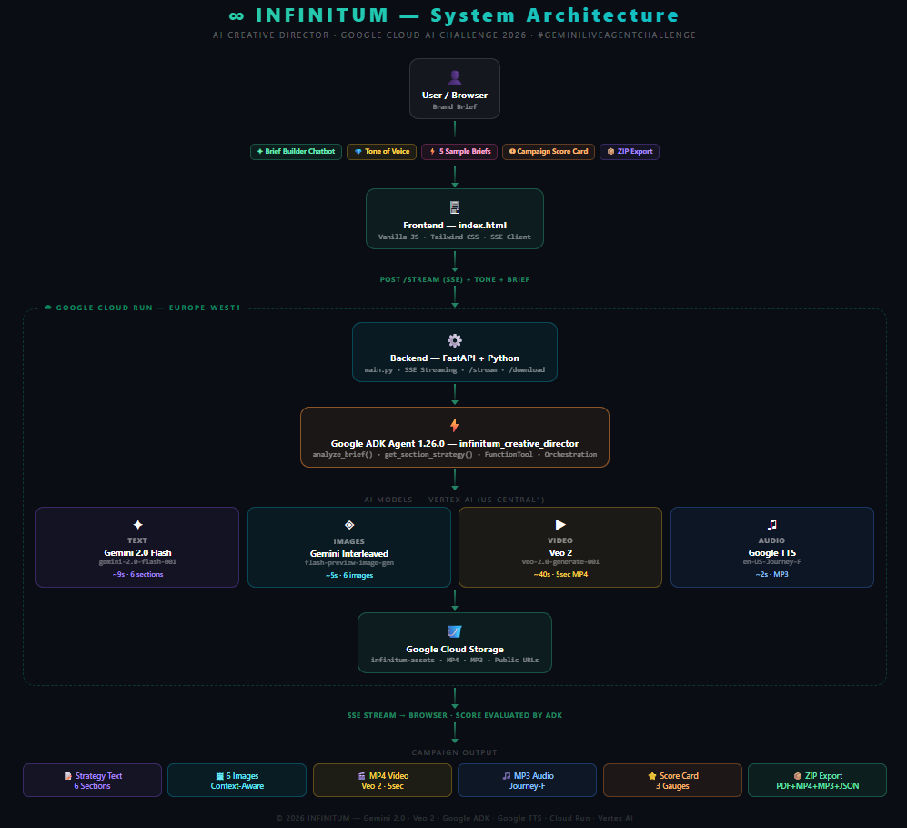 The core is a Google ADK agent called infinitum_creative_director. It uses FunctionTools — analyze_brief() and get_section_strategy() — to extract brand keywords and build a creative strategy for every section before a single word is generated.