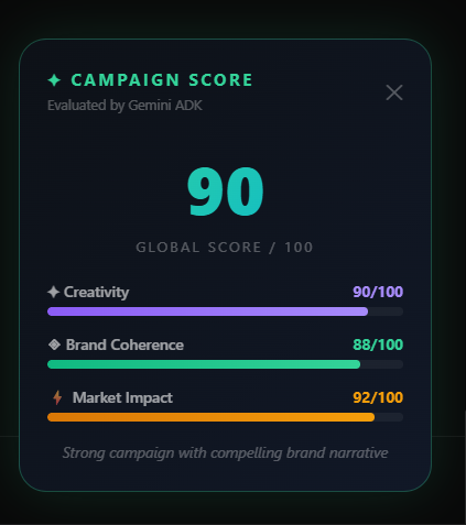 Campaign Score Card — AI self-evaluation with 3 animated gauges: Creativity, Brand Coherence, and Market Impact.