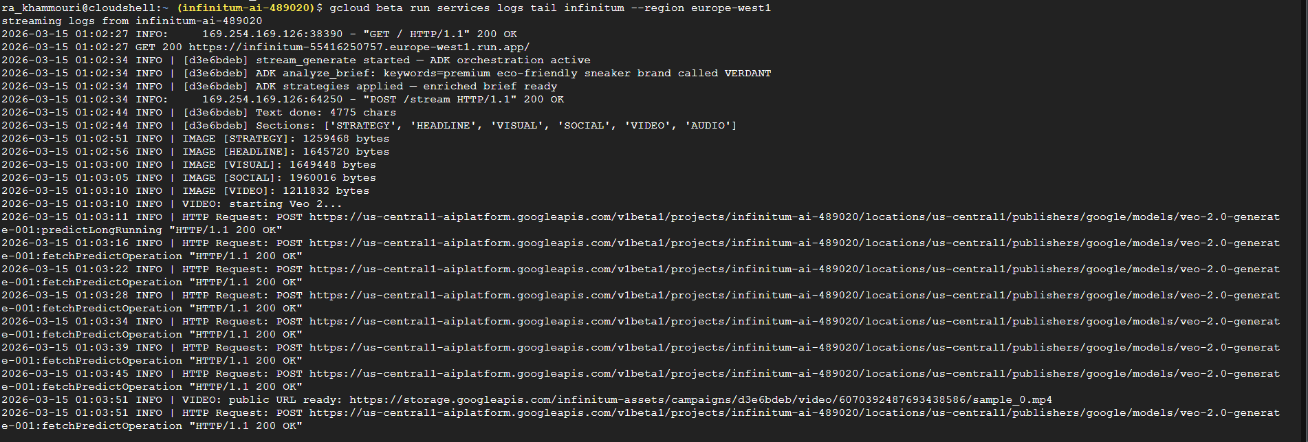Real-time Google Cloud Run logs — ADK agent orchestrating Gemini, Veo 2, and Google TTS live in production.