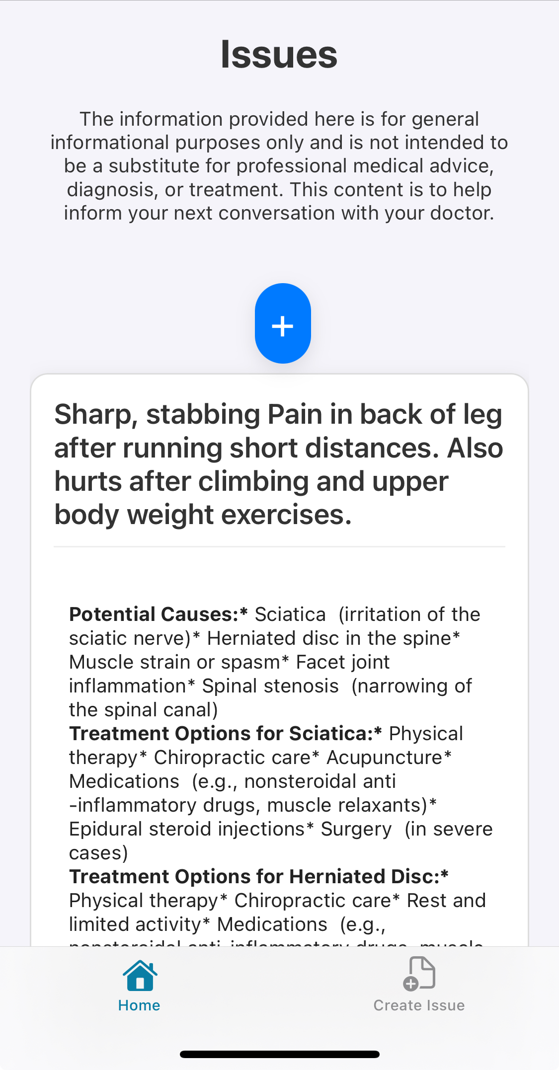 Being unable to articulate what hurts is one of the most frustrating aspects of the patient experience. Through a longitudinal, and visually intuitive issue tracker, we allow pinpointing of pain points on a secure platform. A model agent equipped with the precise muscloskeletal location and intensity, in addition to any relevant contextual factors, carefully researches and returns potential causes and treatments. This allows patients to navigate harm in a number of ways. Firstly, our agent informs them of treatments for common issues, reducing the number of clinical interventions necessary. Second, our agent familiarizes and educates users about relevant medical terminology, putting them on stable footing when it comes to talking with healthcare providers and clinicians. Lastly, through creating records through our simple and intuitive interface, users establish a longitudinal record of their medical issues and treatment options. Such a longitudinal record replaces the all-too-common experience of Googling chronic or persistent pains (“pain in lower back”, “pain in back of leg”), reading a couple articles, and then forgetting about the issue until it happens again.