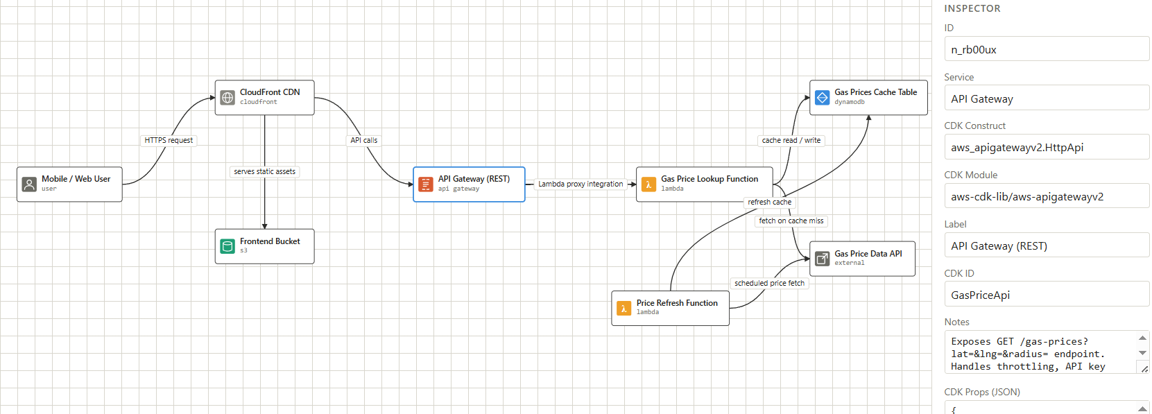 Designing a diagram language that two audiences can read. The graph schema had to be legible to a human editing it visually and precise enough for the CDK agent to consume as a specification. Too loose and the downstream agent guesses; too rigid and the architect agent can't express nuanced relationships. Getting the edge schema right was the key decision that made agent-to-agent handoff reliable.