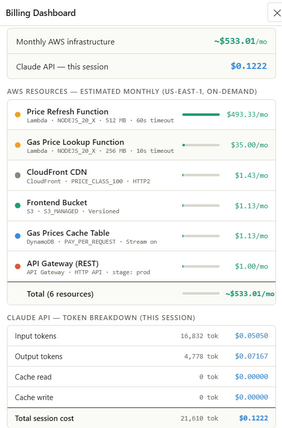anthropic-dangerous-direct-browser-accessrequired careful handling of the agentic loop, tool results need to be round-tripped back as user messages, and a mid-turn API failure shouldn't corrupt the conversation history. We built a clean loop that only commits completed turns to shared history.Cost estimation accuracy. Lambda pricing depends on memory × duration × invocations, all variable. We settled on documented baseline assumptions (1M invocations, full timeout duration) and made those assumptions explicit in the UI so users know what they're looking at.