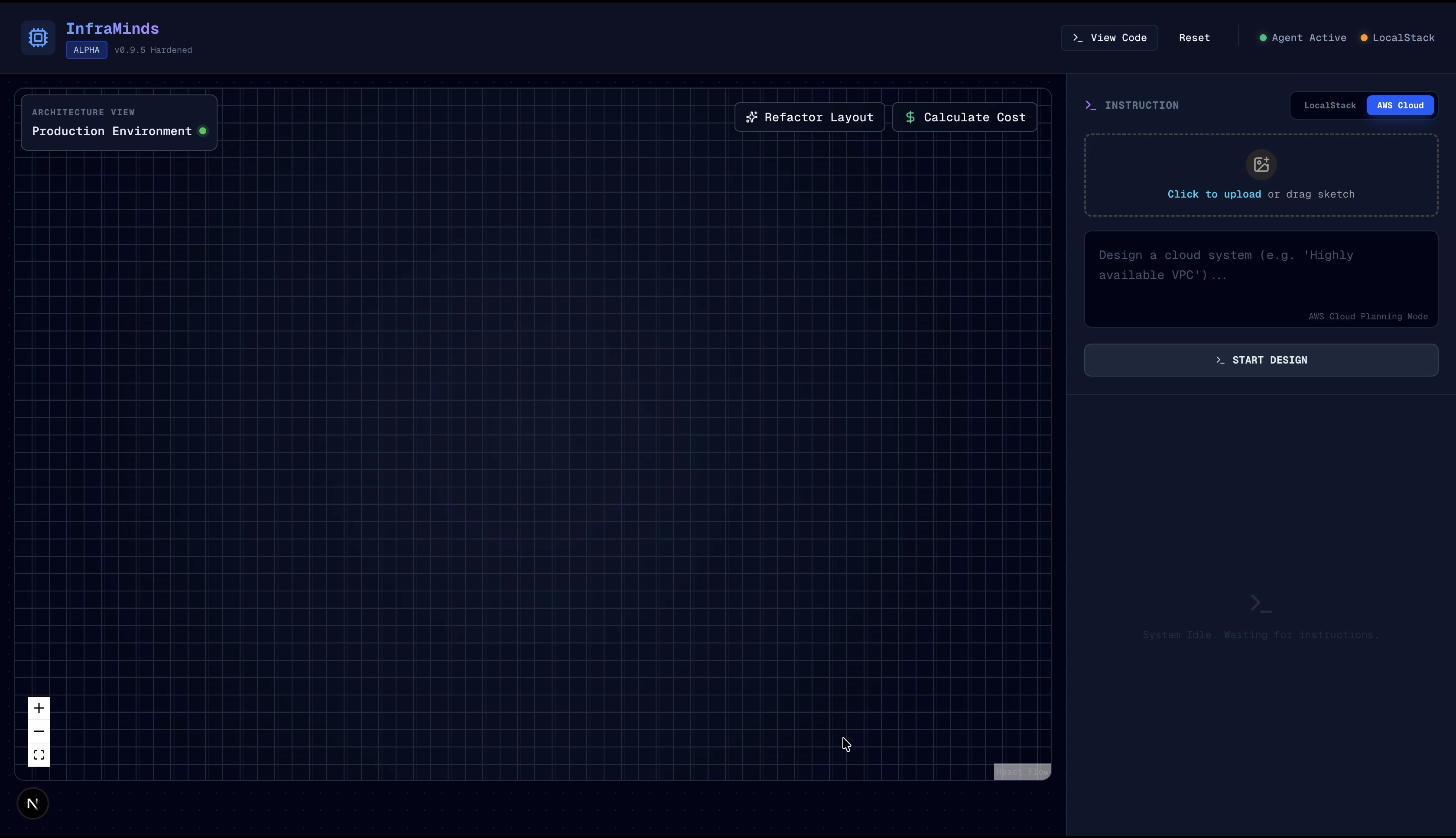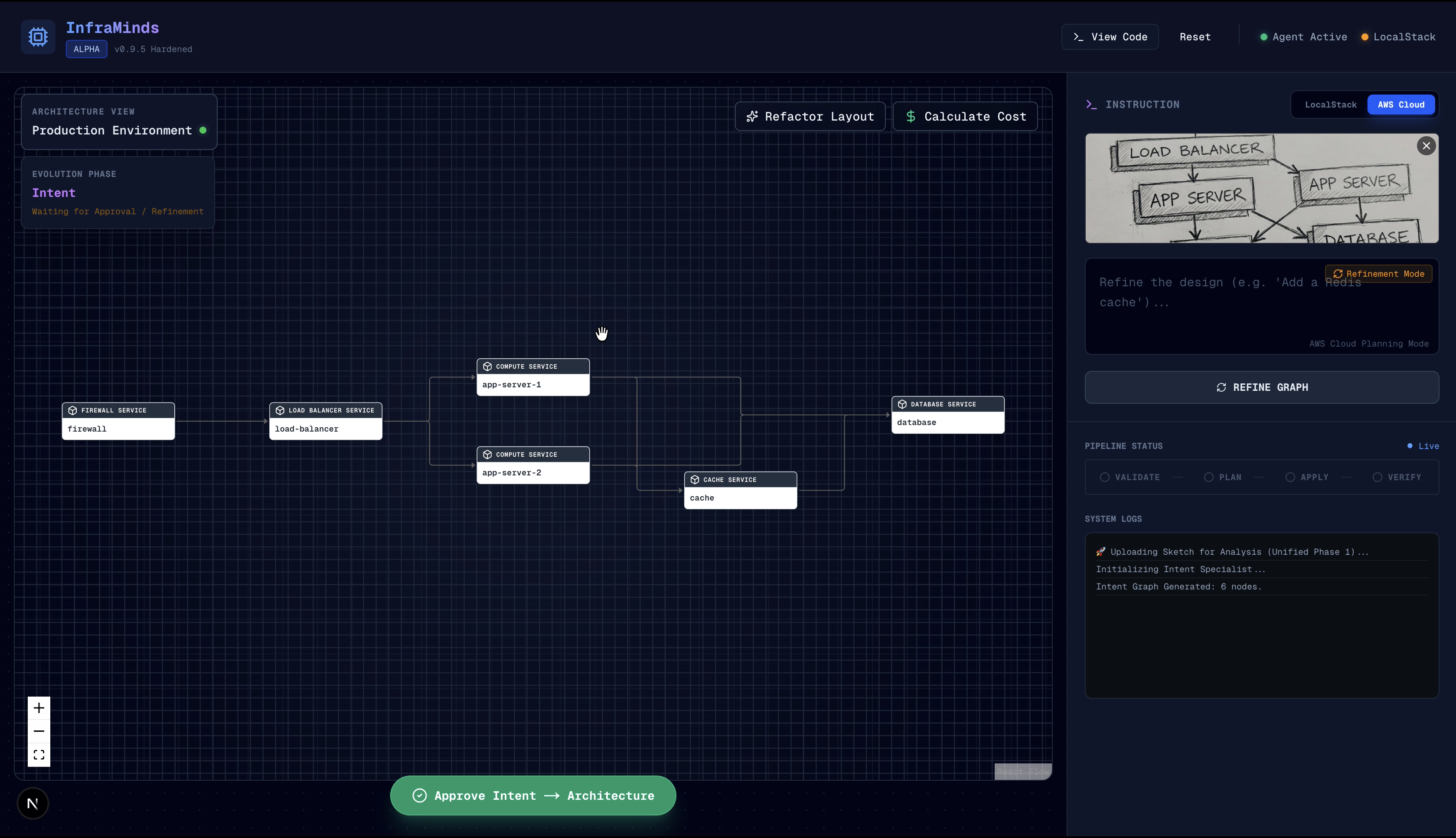 InfraMinds landing experience — where AI transforms intent into verified infrastructure.