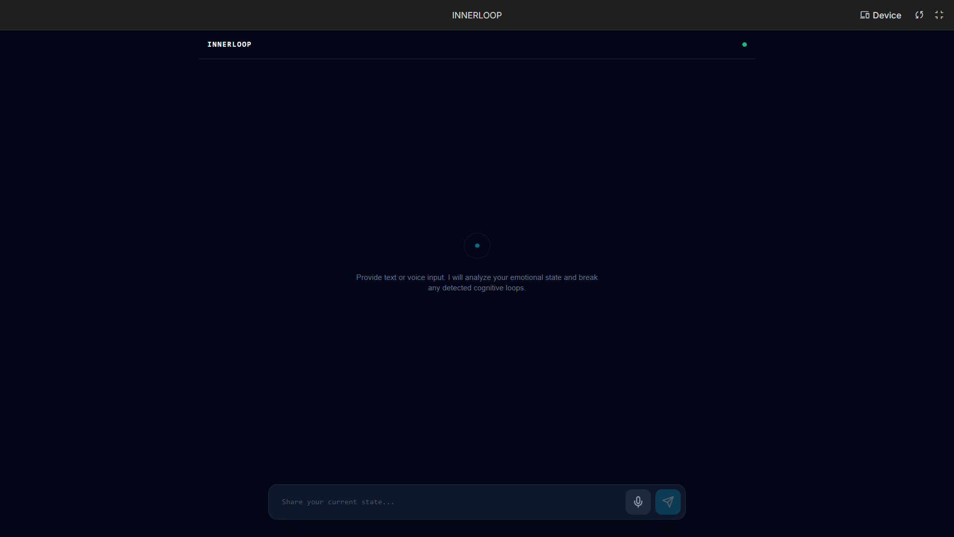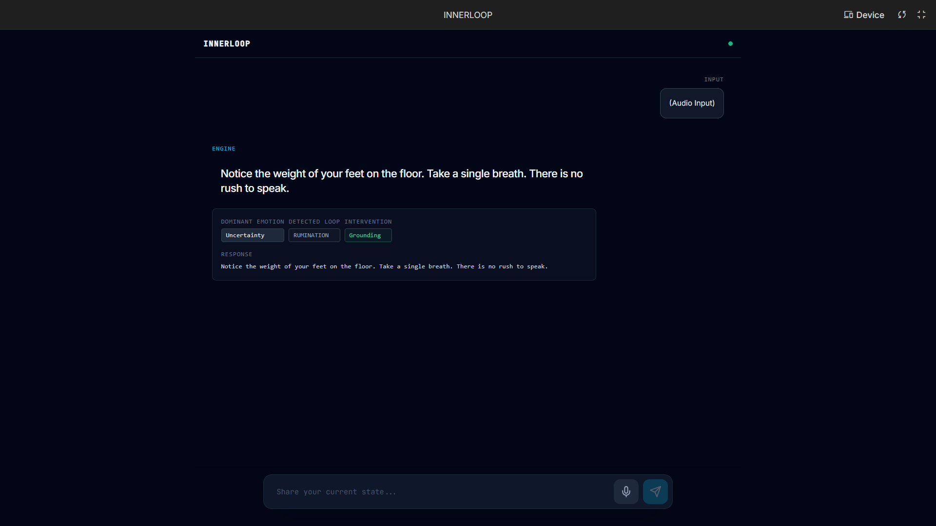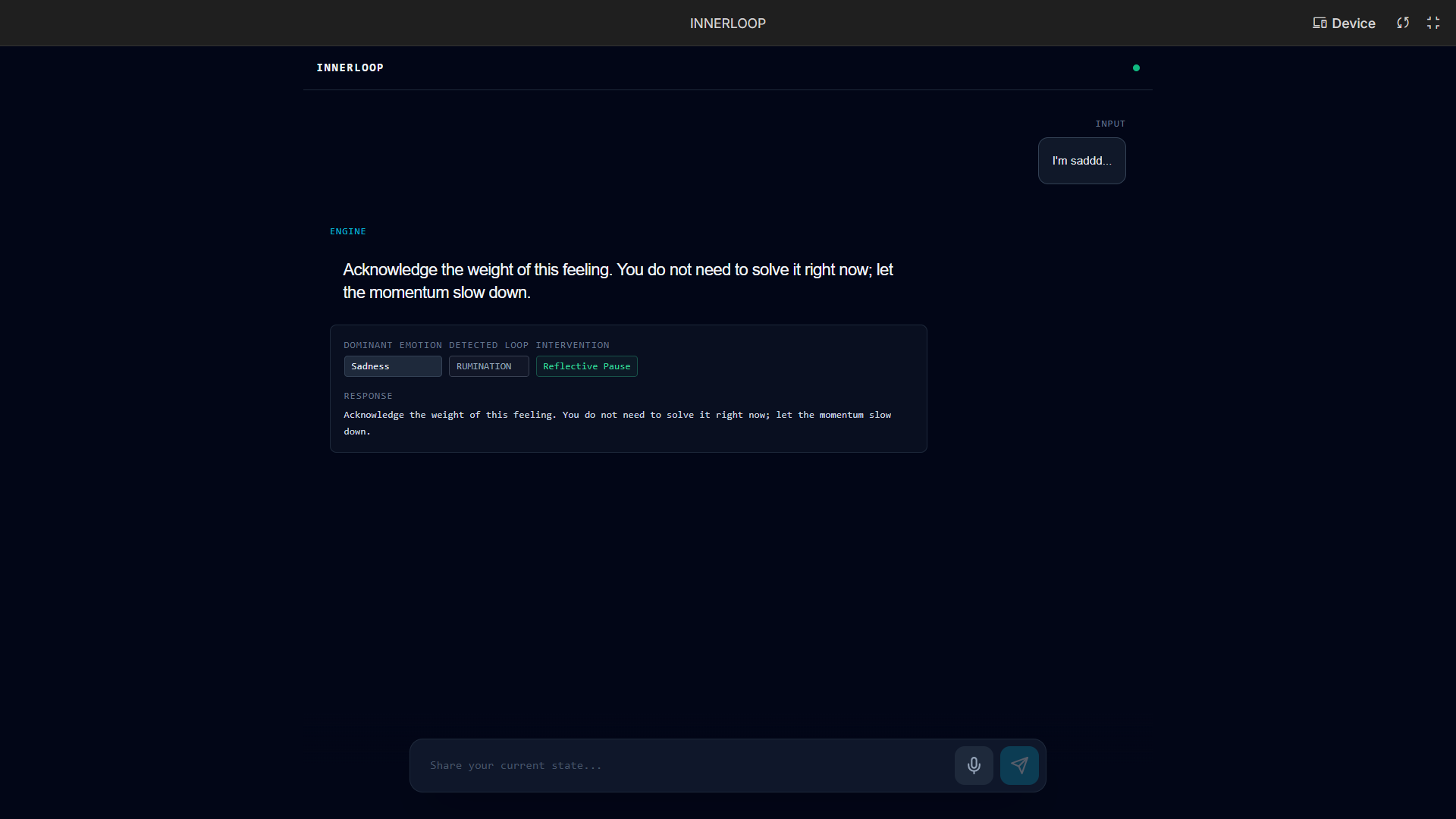 When a user inputs information either through text or voice, INNERLOOP examines it to determine what the primary emotional state might be, whether the user might be stuck in a state of cognitive loop such as rumination, self-doubt, stress build-up, or indecision, and implements a singular intervention approach to help break the cycle.