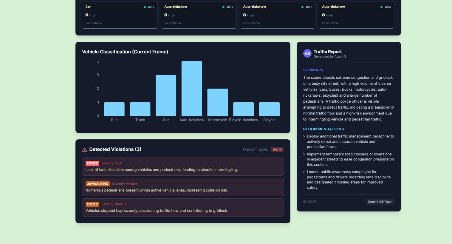 - Vehicle Detection Agent: Detects and classifies vehicles such as cars, bikes, buses, and trucks from live video feeds.