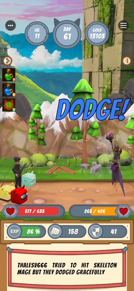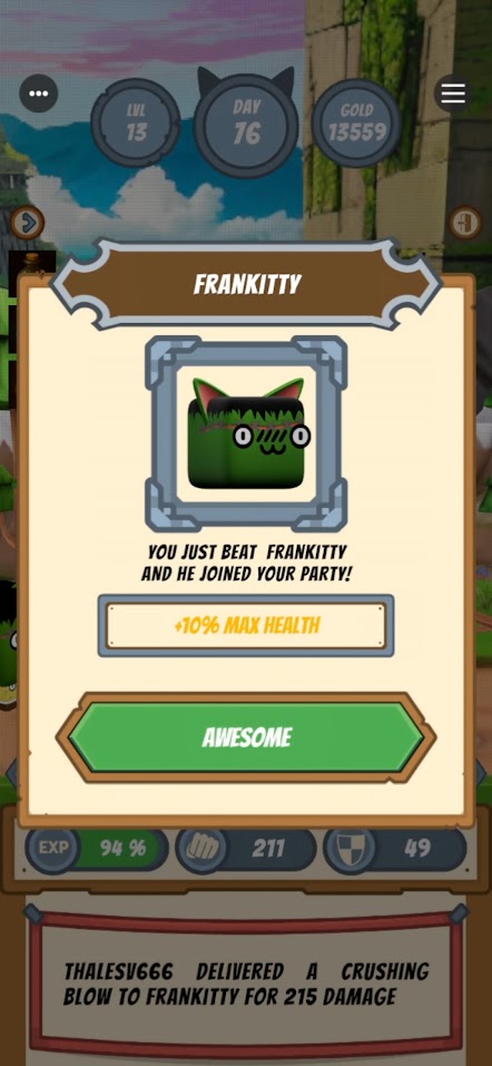 Free the cats from the curse and see they join your party. Cats add different stats to your player.