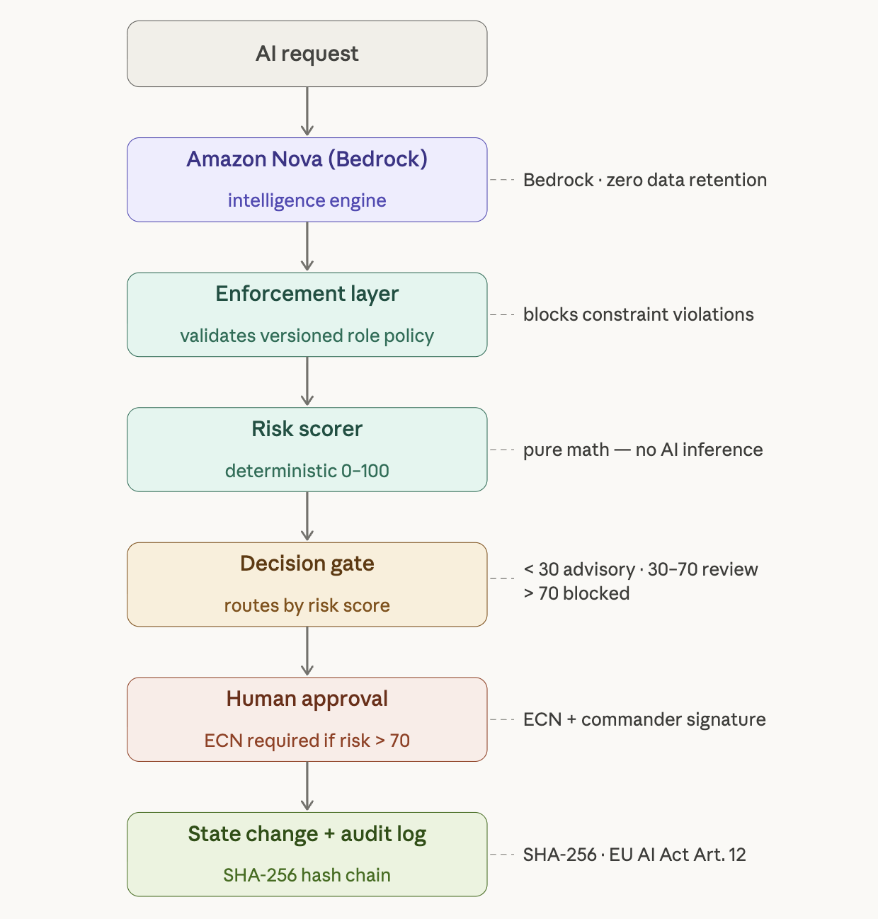 - Decision Gate — routes to the right human authority level. High-risk proposals require an Electronic Change Notice (ECN) cryptographically signed by a human commander.
