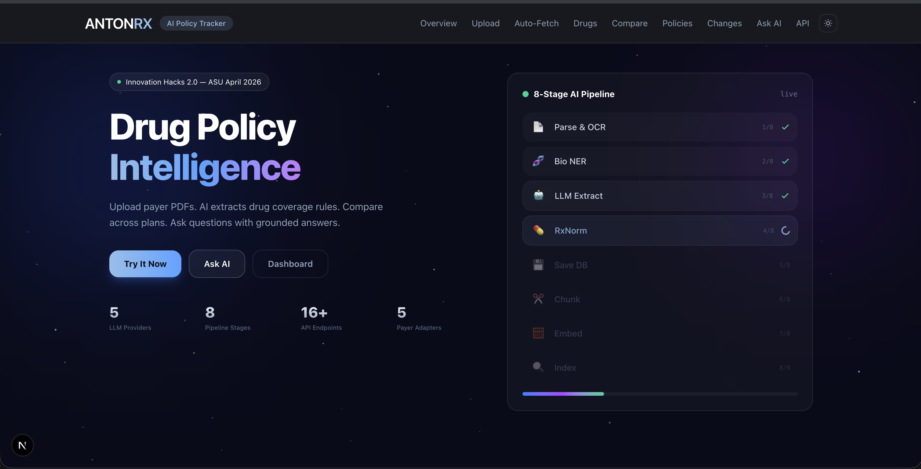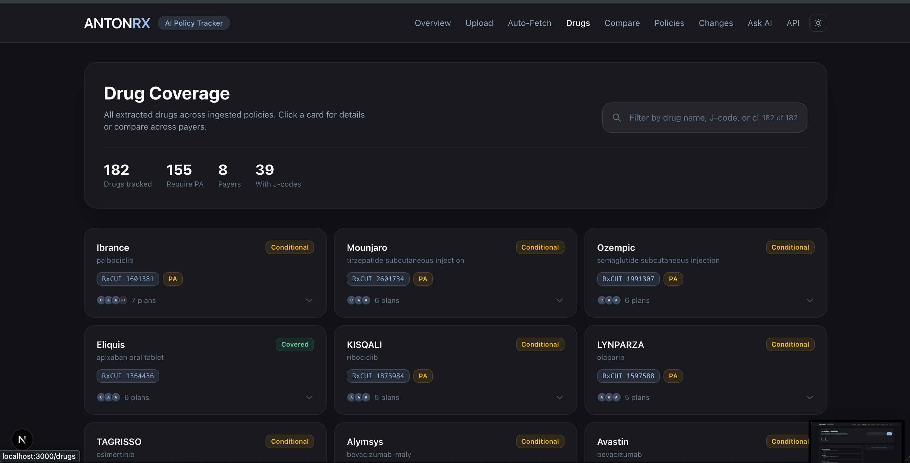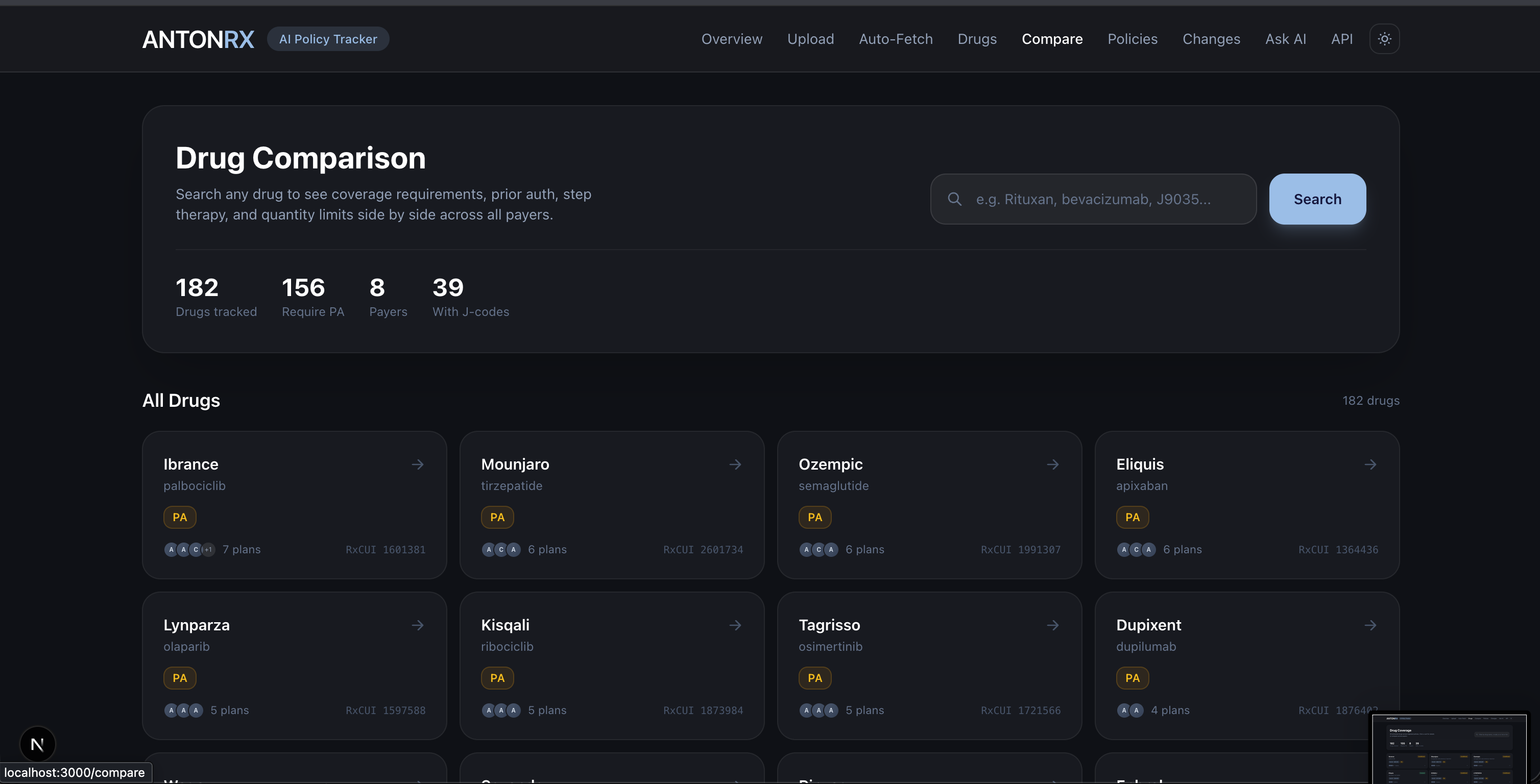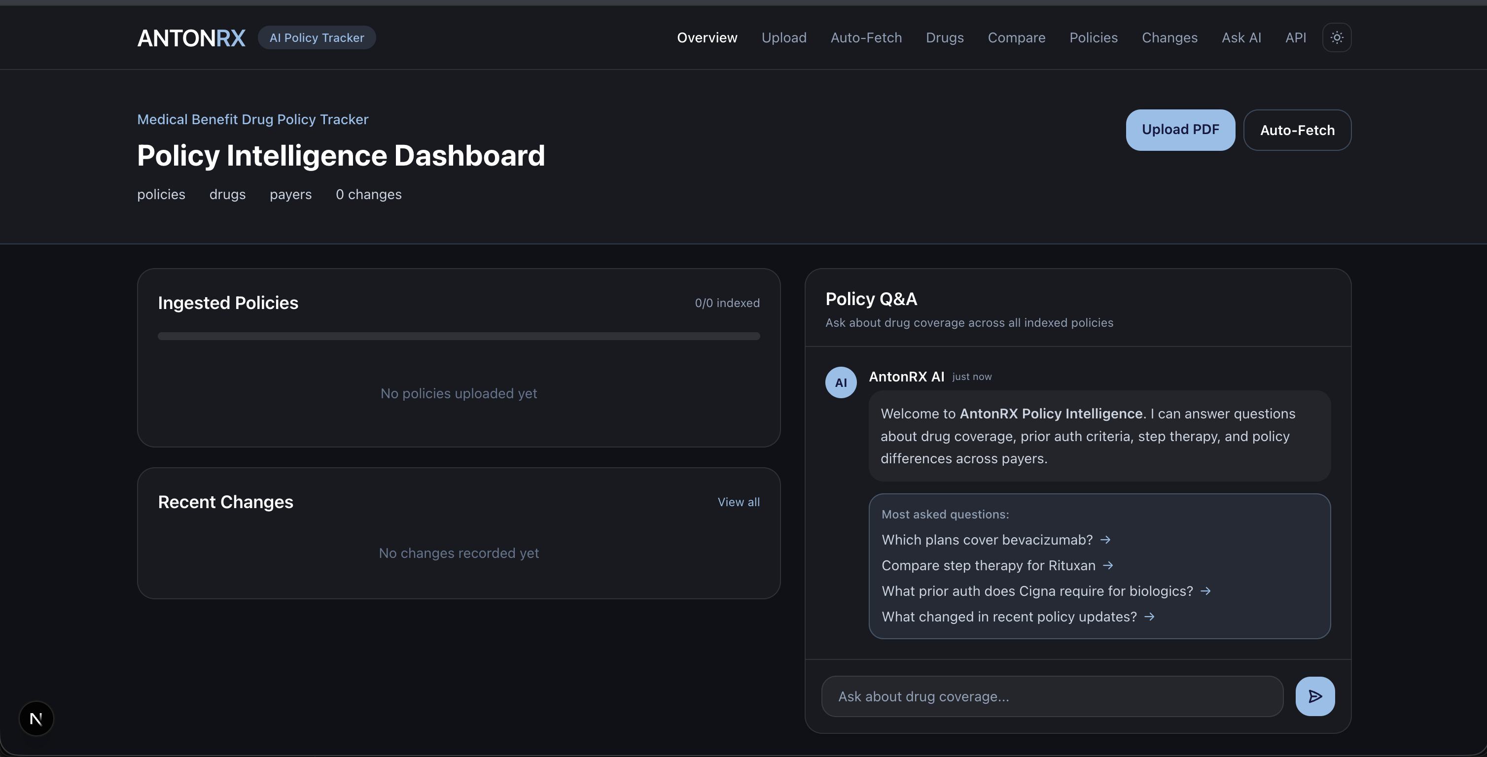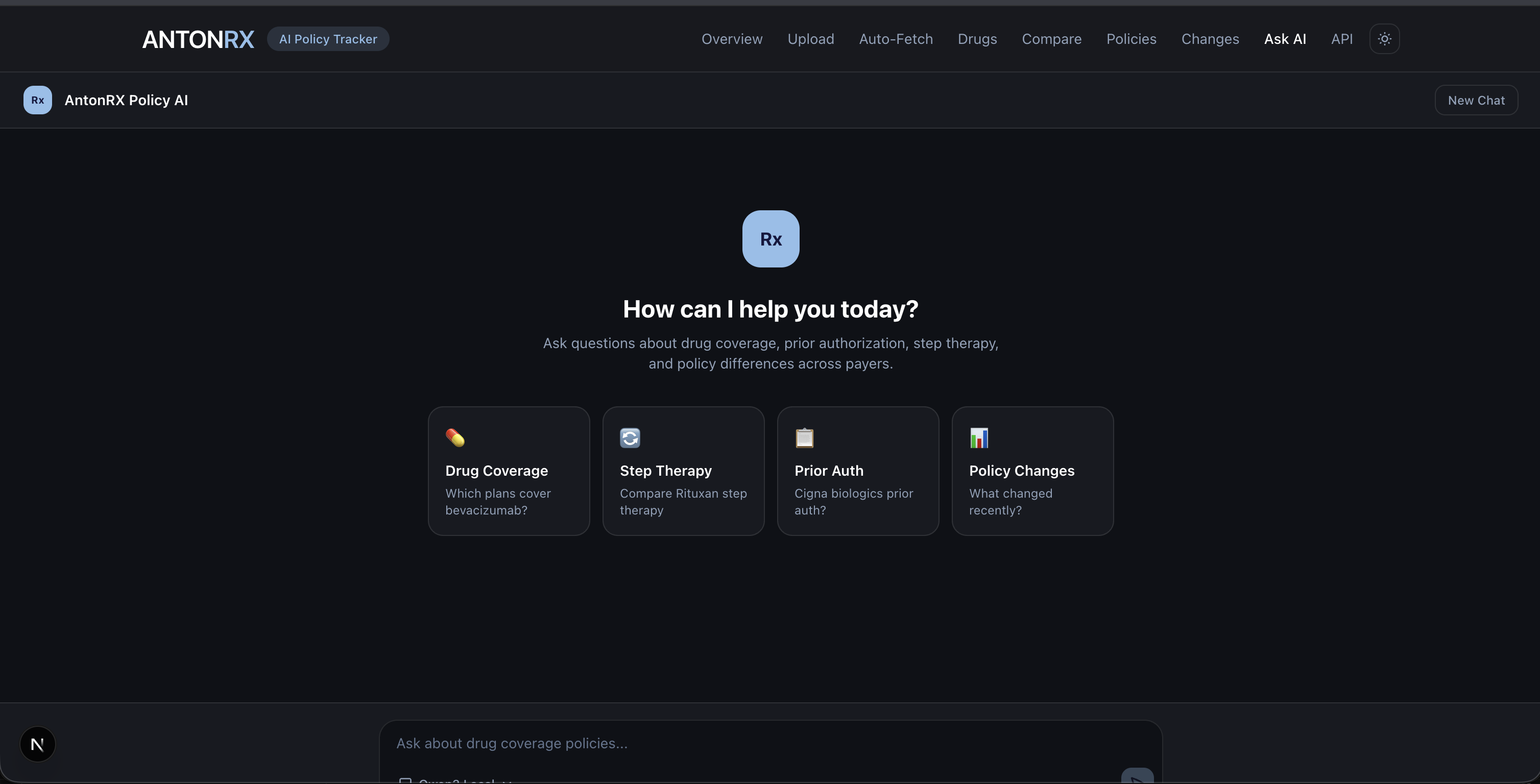 - 11 pages: dashboard, drug search, drug detail, policies, policy detail, compare, changes, chat, fetch, upload, API docs