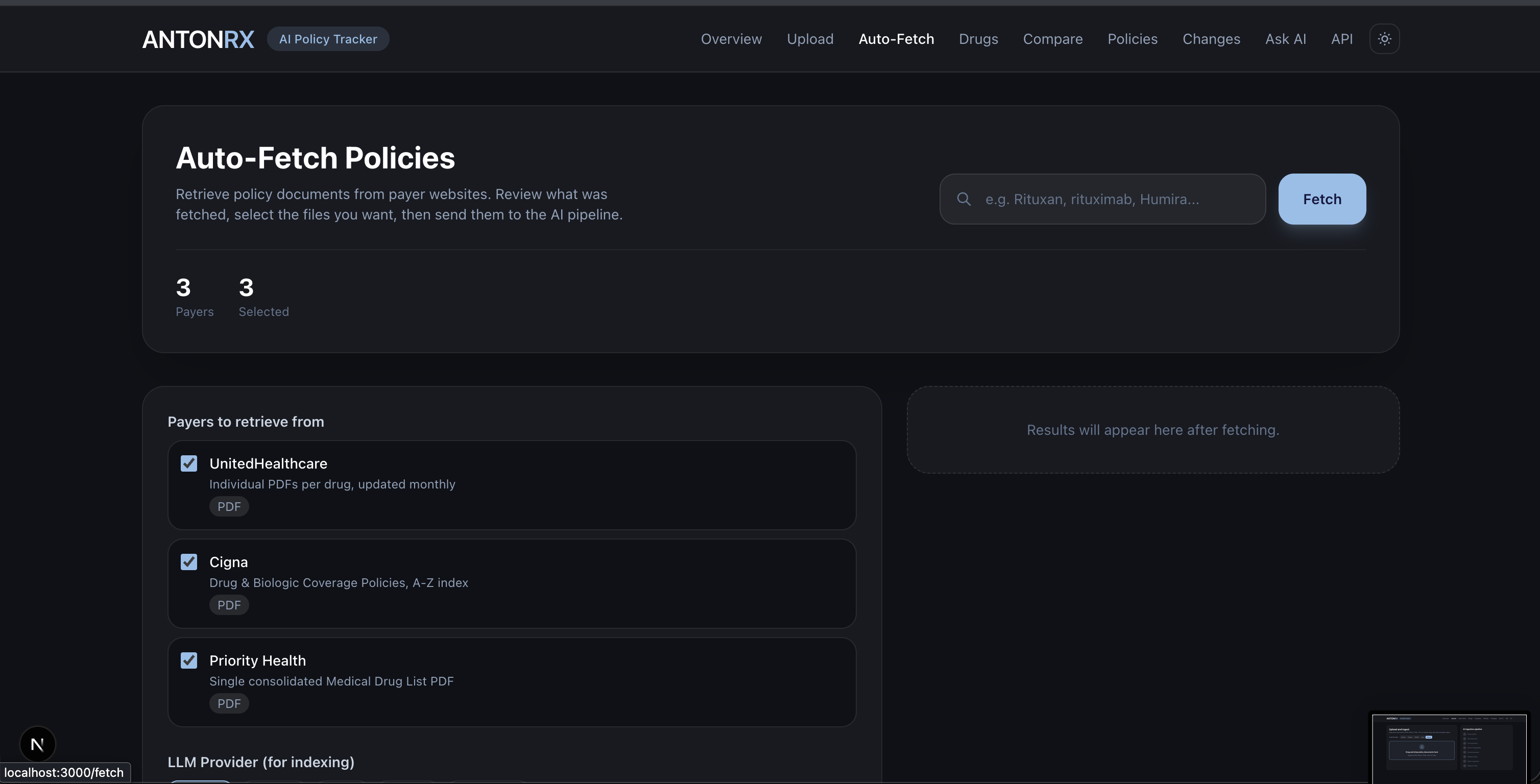 - Auto-Fetch — Pull policy documents directly from supported payer websites (UnitedHealthcare, Cigna, Priority Health) without manual downloads.