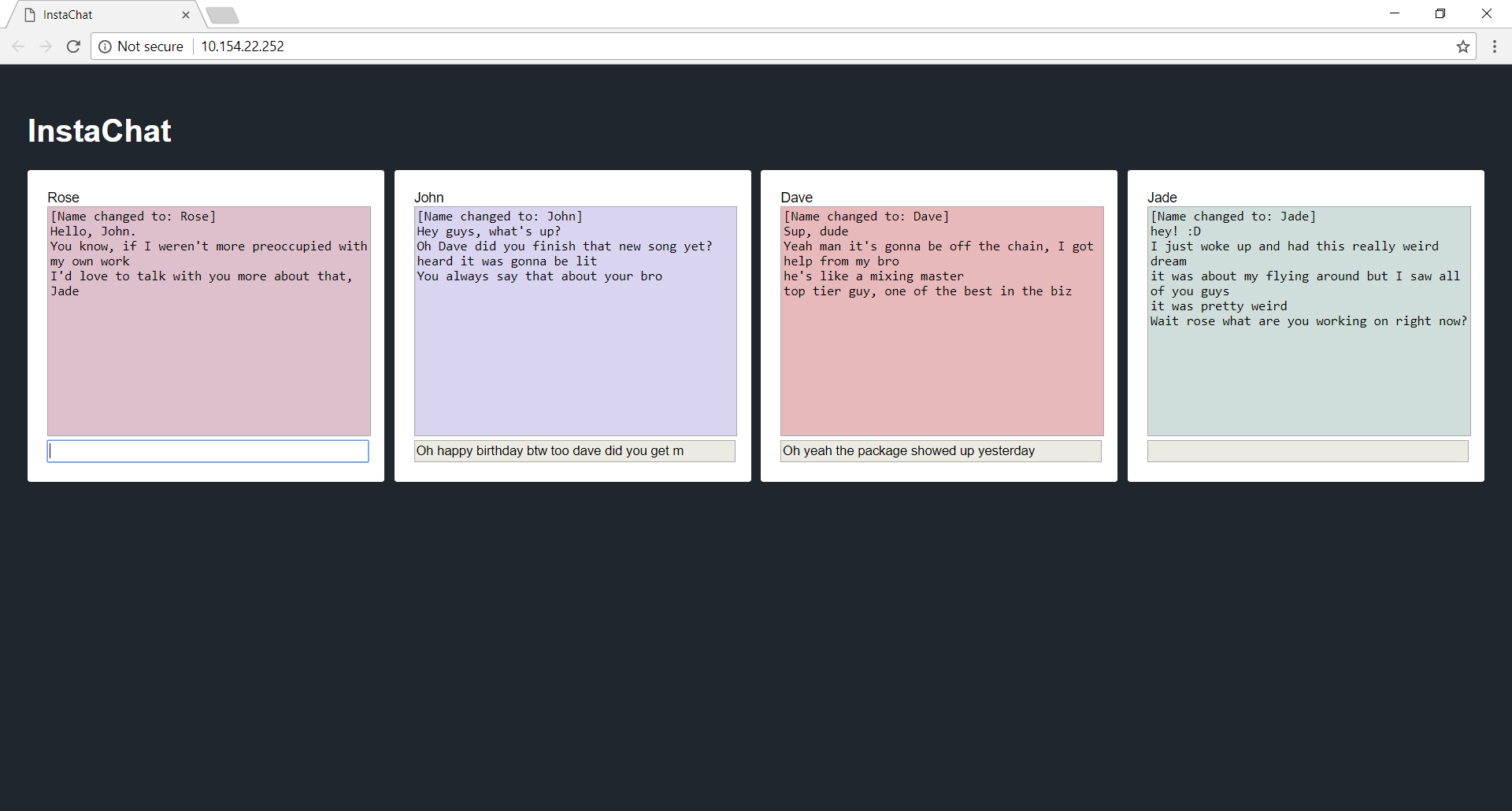 This project was inspired by all sorts of anonymous online chat sites. The instantaneous chat feature allows for a much more intimate and personal dynamic compared to other chats, and it feels much more like talking to a real person.