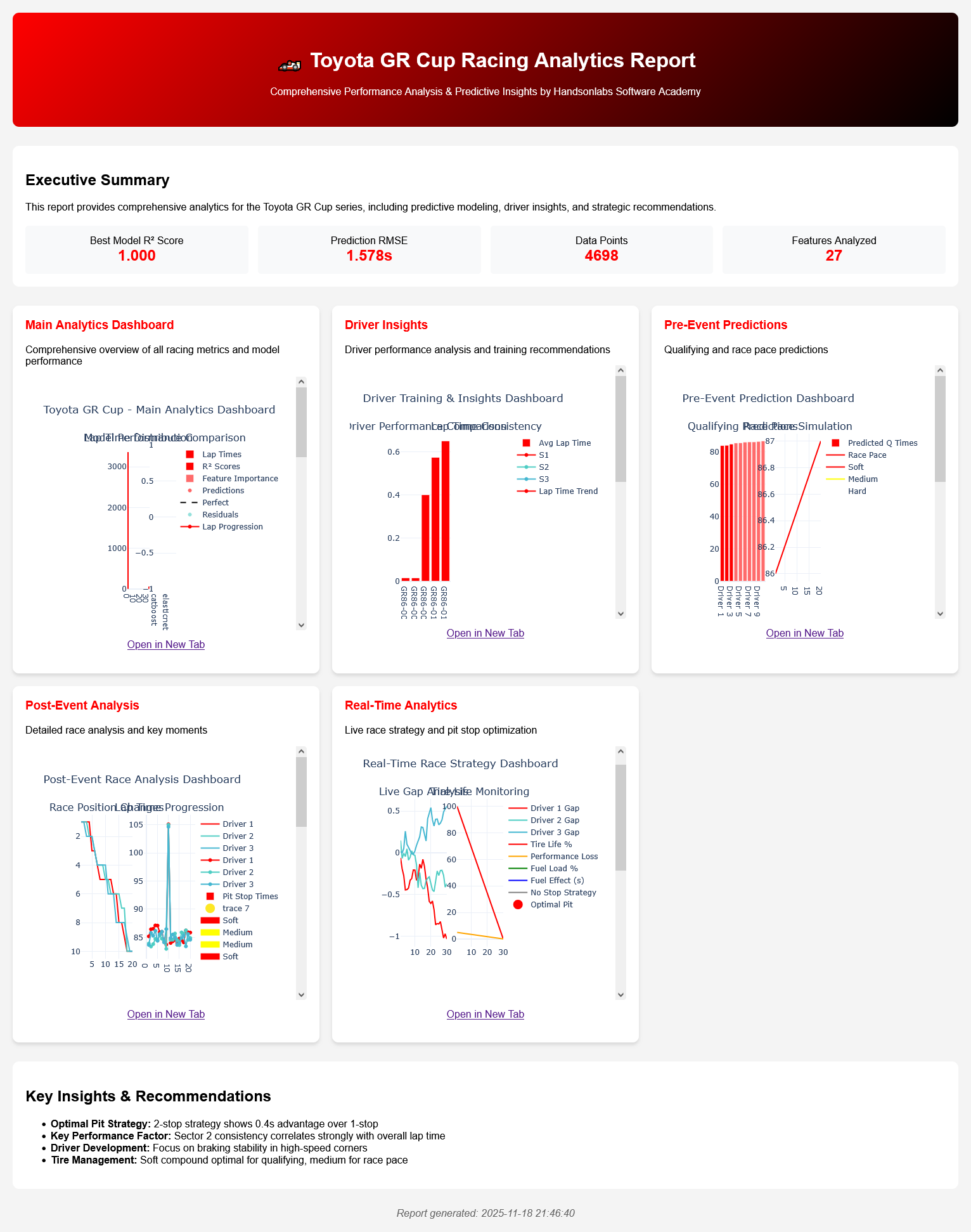 This describes the design, implementation, and empirical validation of an integrated analytics dashboard tailored for the Toyota GR Cup series, emphasizing telemetry-driven feature engineering and workflow components for pre-event forecasting, post-event analysis, and real-time strategy. We detail a scalable data ingestion and preprocessing architecture that recursively locates multi-source CSV telemetry and race-result files, handles common encoding and format issues, and applies memory-aware loading strategies to accommodate resource‑limited environments. Feature engineering modules convert raw telemetry (e.g., accelerations, speed traces, and sector times) into aggregated indicators: rolling means, consistency metrics, stint-aware lap counters, and pivoted telemetry matrices indexed by vehicle and lap. The analytics stack integrates a suite of predictive models (tree ensembles, CatBoost/XGBoost/LGBM variants, and lightweight deep learners) with visualization engines (Plotly, Bokeh, Dash) to produce five interactive dashboards: Main Analytics, Driver Insights, Pre-Event Predictions, Post-Event Analysis, and Real‑Time Strategy. Each dashboard is designed around actionable decision-making: driver-level coaching cues from sector variance and braking stability analyses; qualifying and race-pace simulations under alternative tire and fuel strategies; pit-stop optimization using simulated undercut/overcut gains; and post-event storytelling that synthesizes position-change timelines, pit analysis, and key race moments. We provide implementation details for integrating model outputs into HTML dashboards, including generating feature‑importance visualizations, prediction vs. actual plots, residual diagnostics, and strategy tables. The system supports serialization of models and preprocessors for consistent reproducible inference and describes operational heuristics for live deployment incremental telemetry sampling, lightweight model inference, and web-based visualization hosting. Validation on Toyota GR Cup datasets shows that the dashboard enables simpler conversion of model insights into team decisions: pre-event predictions reduce expected race time by informing tire choice and pit scheduling in simulation, while post-event analysis highlights driver-specific training opportunities with sector-targeted recommendations. Beyond performance, we address practical constraints: robust handling of missing and malformed telemetry, strategies to limit memory usage, and guidelines to prioritize features for dashboard real estate. The paper closes with a roadmap toward automated A/B testing of strategy options and a discussion of how integrated analytics can shorten the loop between data collection, insight generation, and on-track execution for racing teams. Keywords: Racing analytics, Telemetry processing, Interactive dashboards, Pit strategy, Tire degradation, Driver insights, Pre-event prediction, Post-event analysis, Real-time analytics