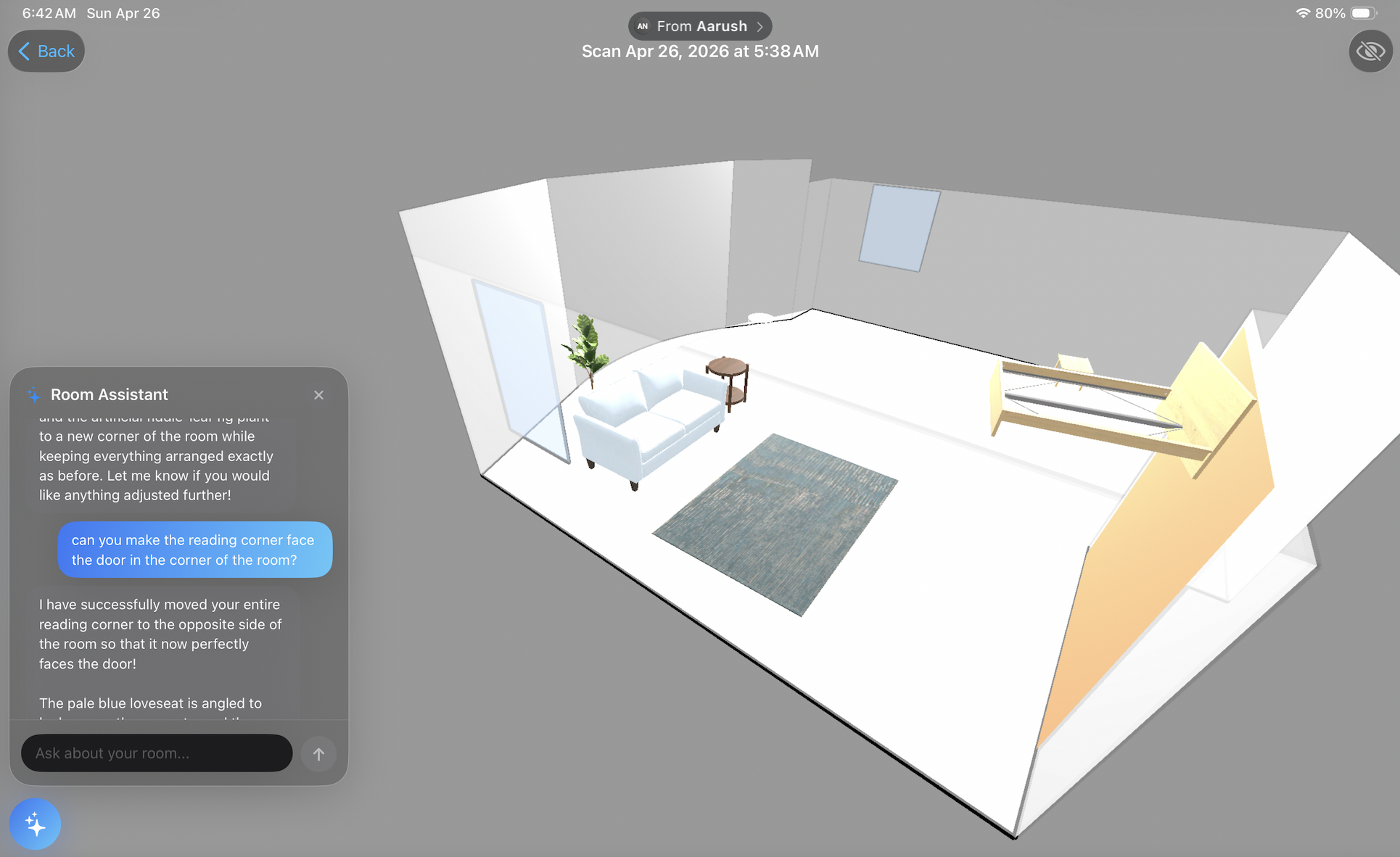 You can launch a scan, which generates the spatials --> given your room, you can query "Make me a cozy study book corner with a couch, rug, and a chair." --> In subsequent interactions with the prompts, you could ask it a followup: "can you move the rug from behind the couch to in front" or "apply Feng Shui principles to the setup, and ensure the sofa is 2 feet away from any entrance." With each step, it will generate a different configuration given your constraints.