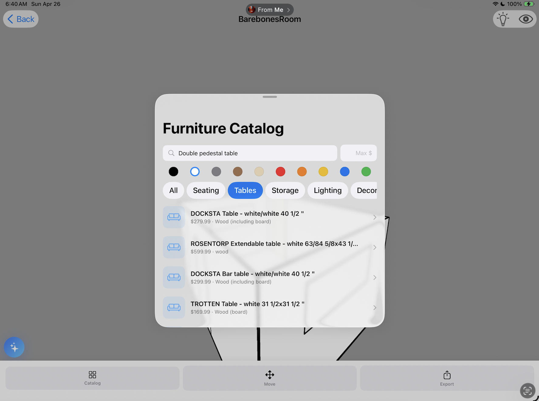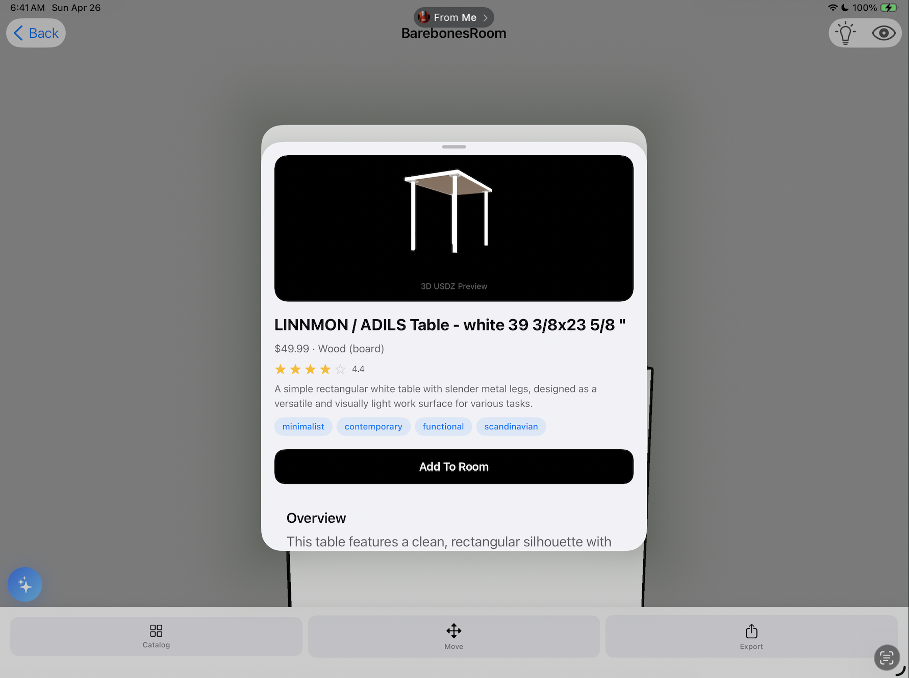 - More Diverse Furniture Catalog - We gathered all our furniture data from IKEA because the website had the most convenient format to scrape from. However, IKEA furniture has quite a distinctive “style”, meaning that certain styles were quite underrepresented in the application. If we had more time, we would devise a way to translate even more furniture items from other furniture websites into 3D object files for our database.