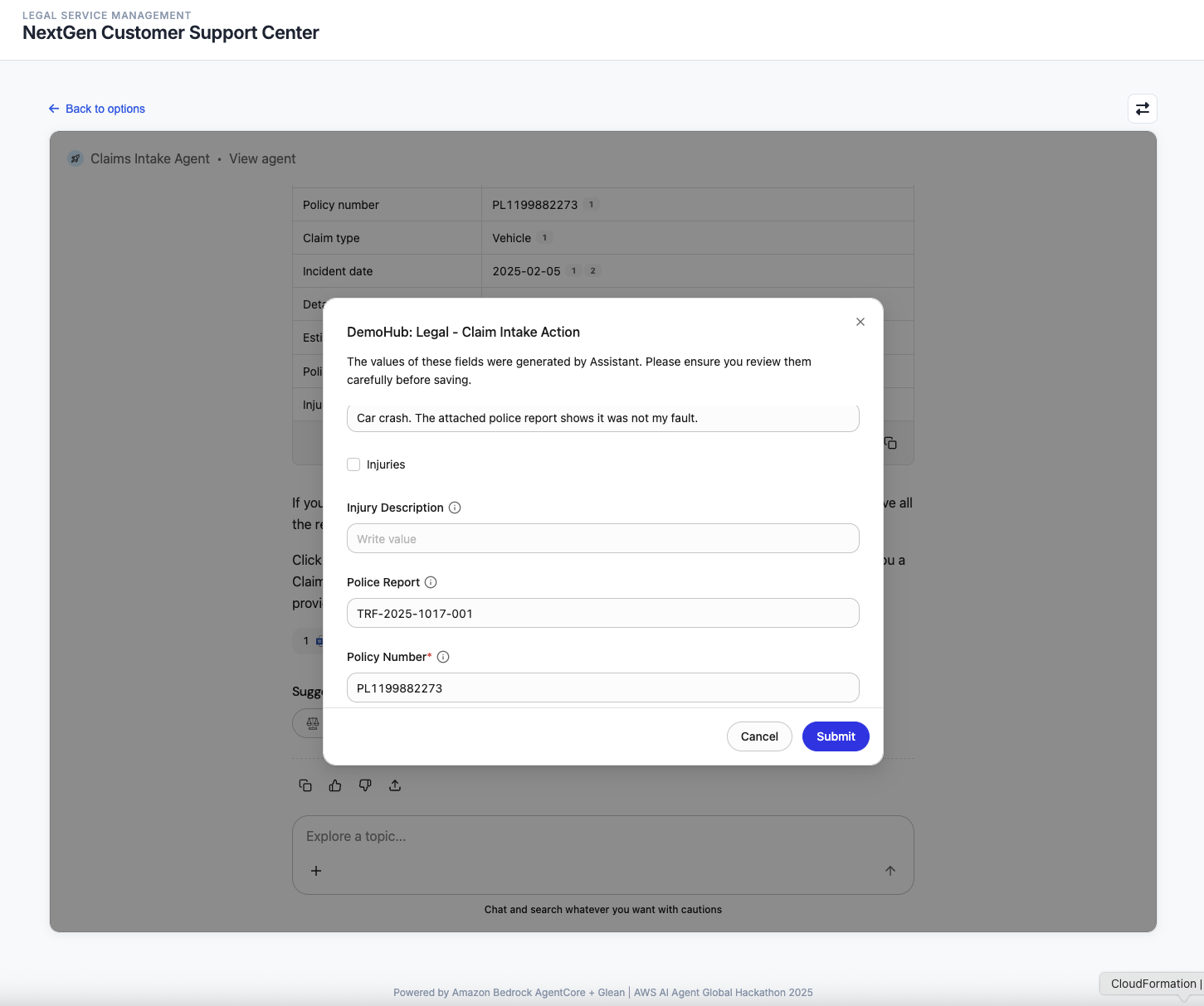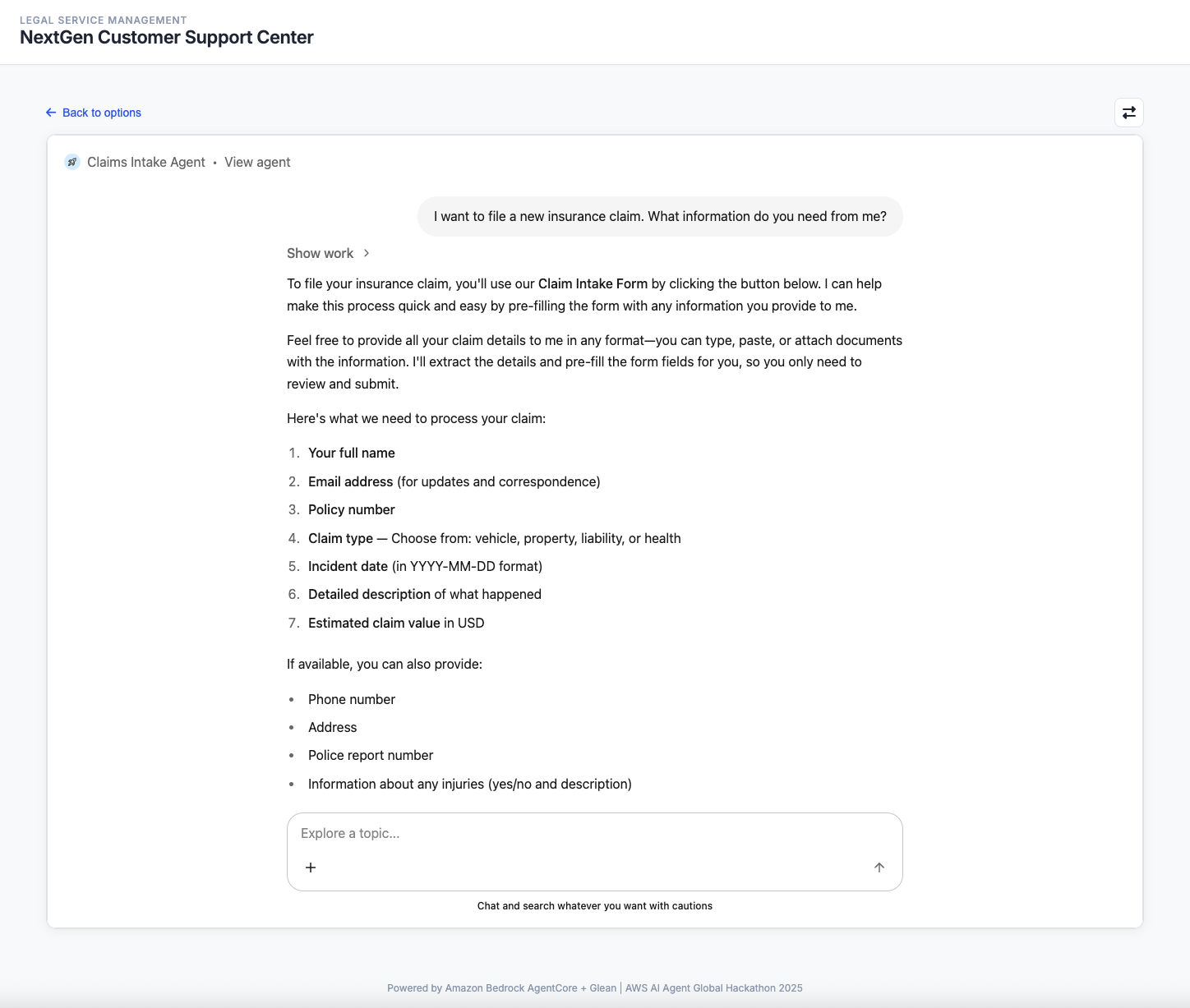 Insurance claims processing is broken. Endless forms, weeks of waiting, and manual routing waste everyone's time. We saw an opportunity to combine Glean's conversational AI with Amazon Bedrock AgentCore's autonomous agents to transform claims from a painful bureaucratic process into an intelligent, seamless experience.