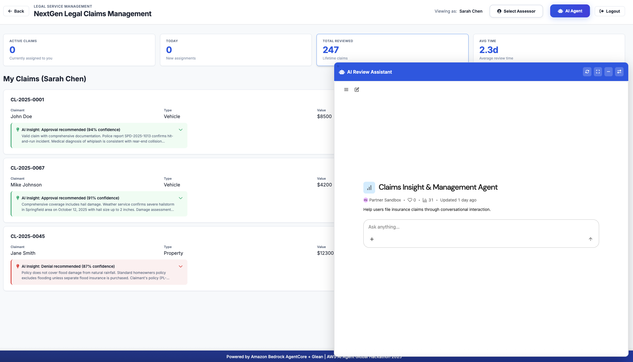 Submitter Portal: Conversational claim filing through Glean chat or web forms. AI guides customers through a submission experience, extracts the relevant data from natural language/attachments, and intelligently routes claims to the optimal reviewer based on skills & workload metrics. While this occurs, a separate AgentCore agent does a data-driven review of the claim with additional context provided by Glean's enterprise knowledge graph.