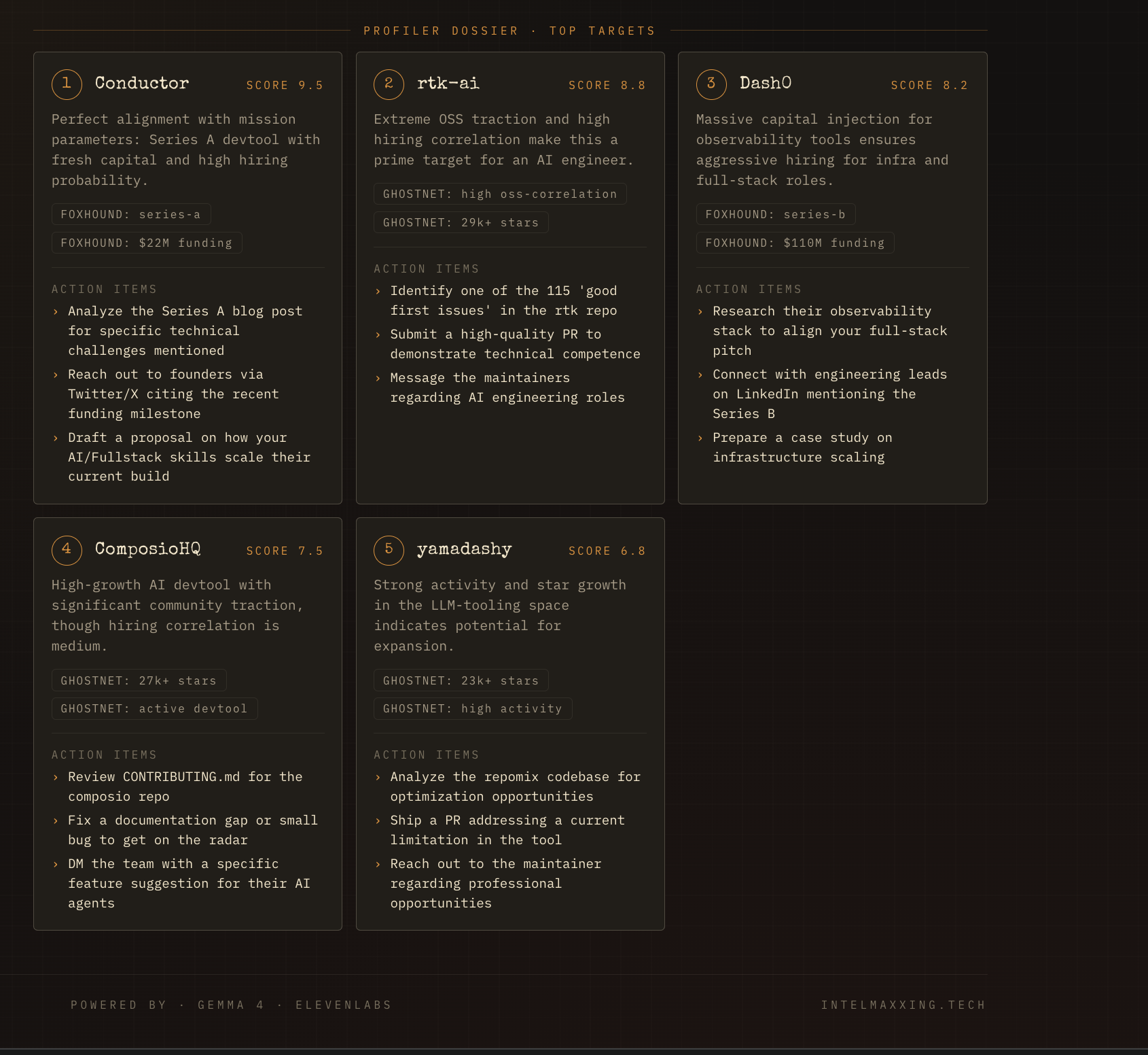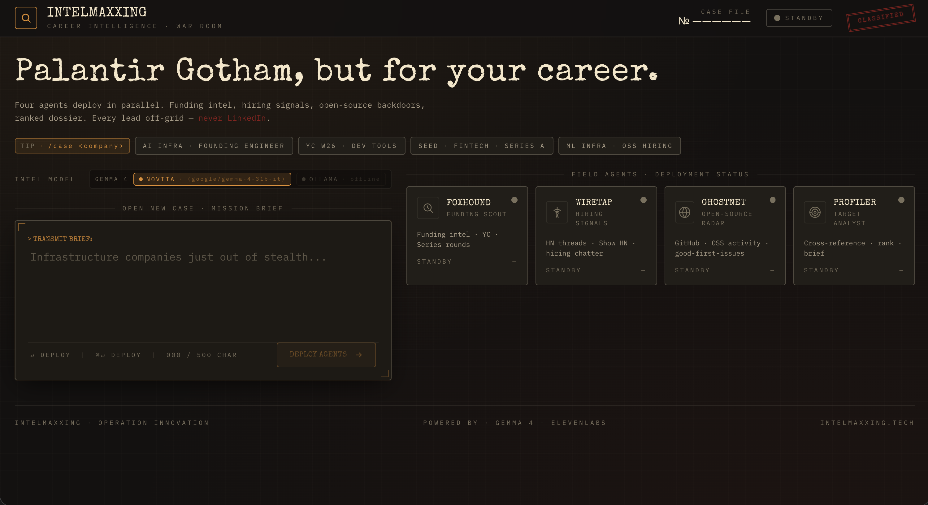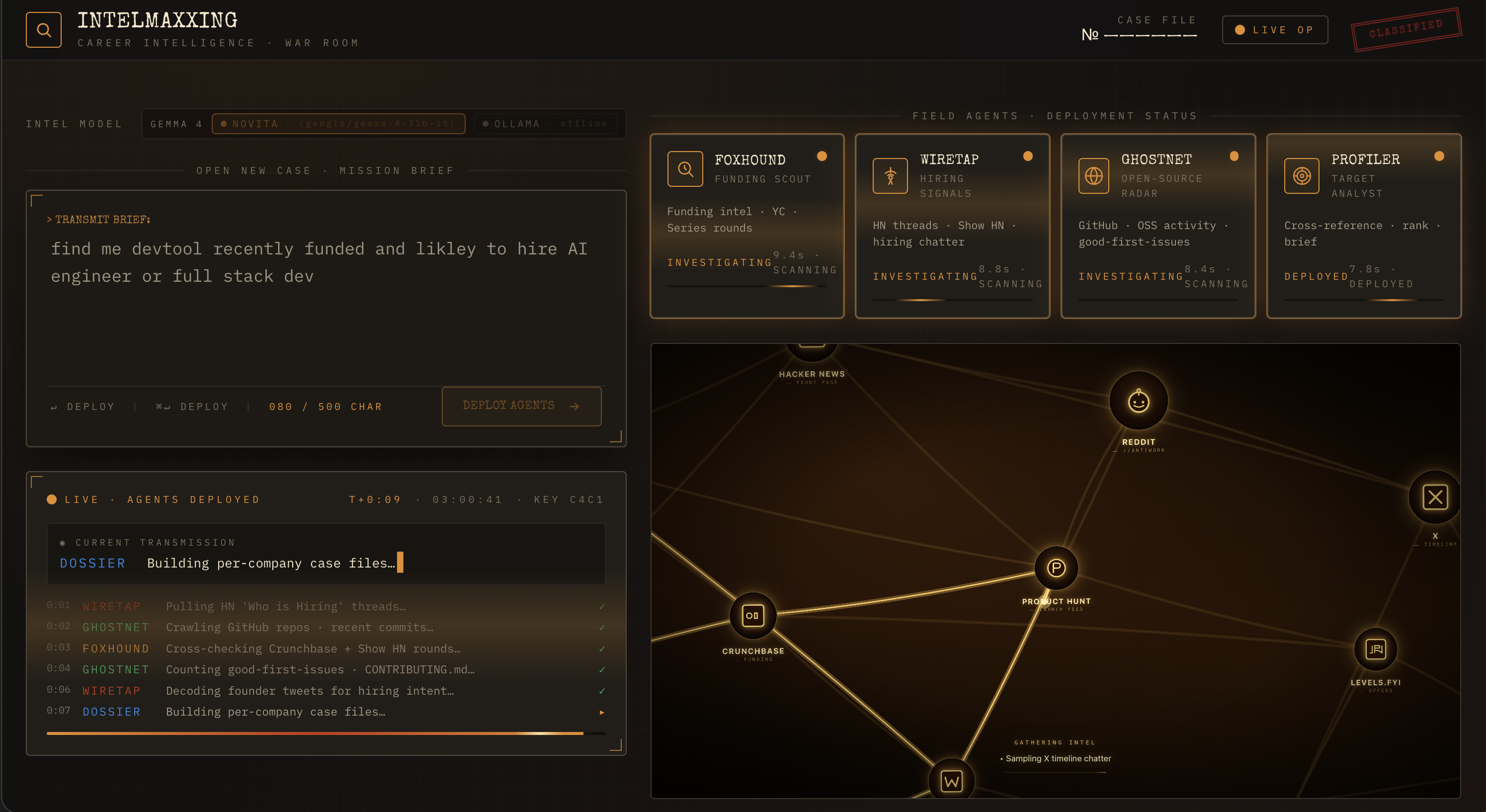 IntelMaxxing is a career intelligence pipeline. You describe a mission in one sentence. Five AI agents deploy in parallel across eleven live sources. A full dossier lands in about twenty seconds.