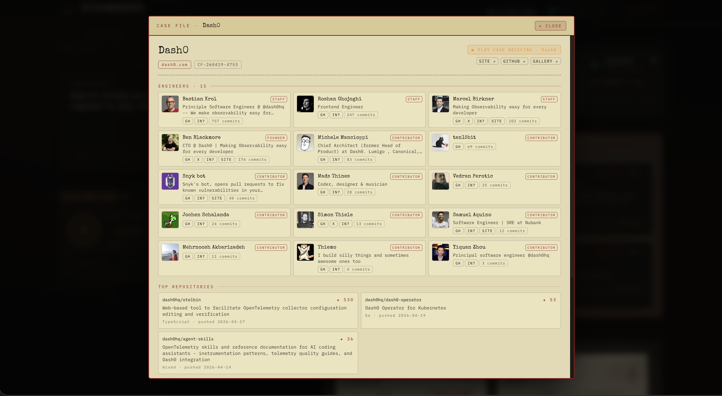 Type /case and a manila folder peels open with every public engineer ranked by commits, every guessed email pattern, and a Reddit red-flag sweep — ghost interviews, rescinded offers, layoff chatter surfaced before you send the email.