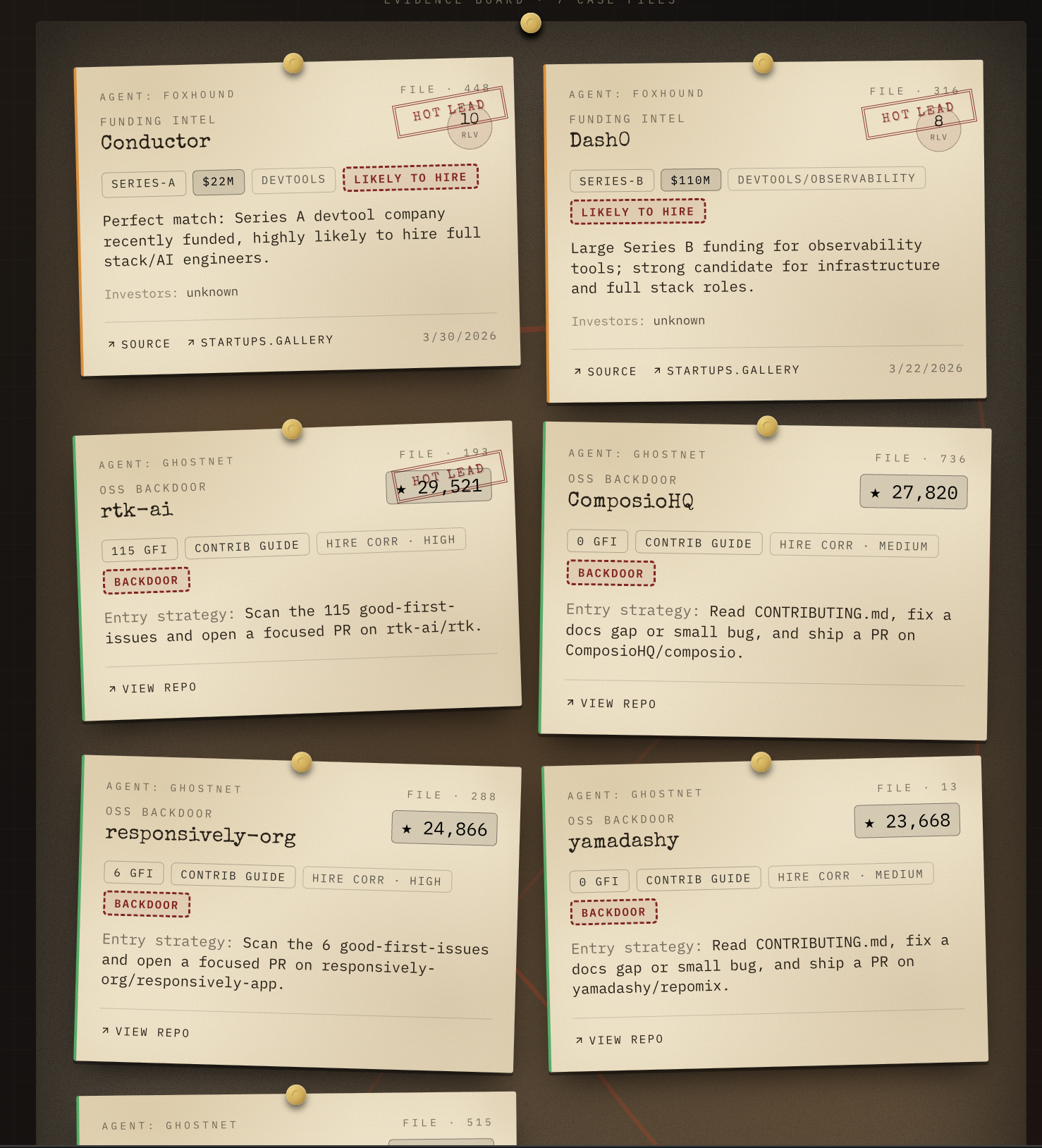 - DOSSIER — per-company case files with founder emails, Reddit chatter, and a draftable cold email