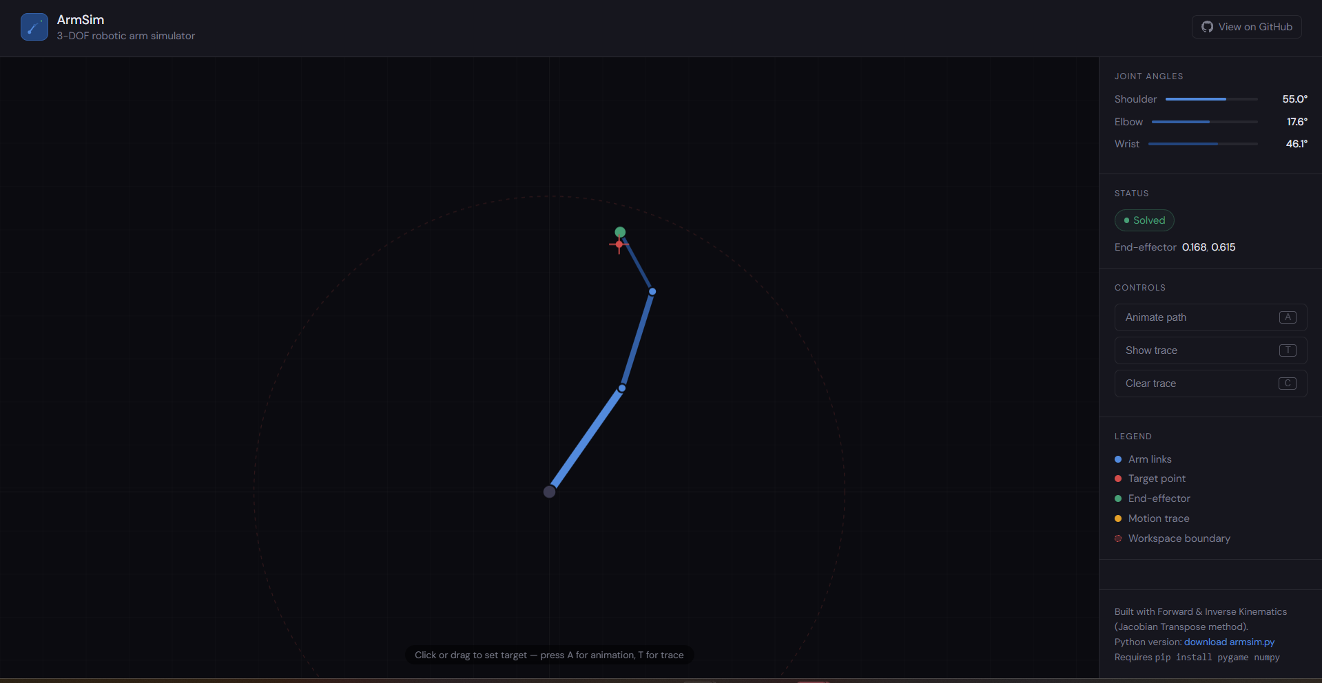 ArmSim is a real-time interactive robotic arm simulator. The user clicks or drags anywhere on the canvas to set a target point, and a simulated 3-joint (3-DOF) robotic arm smoothly moves its end-effector to reach that point, solving the underlying kinematics automatically.