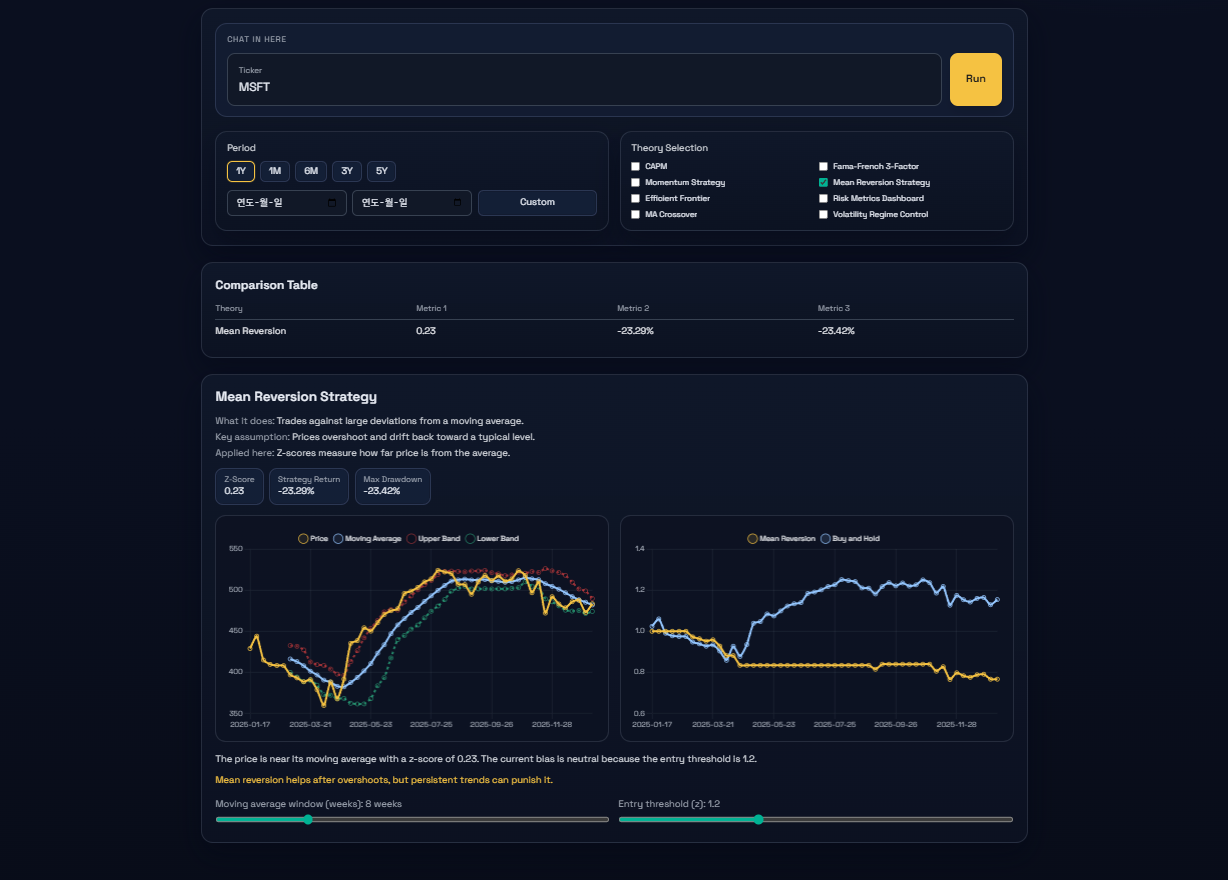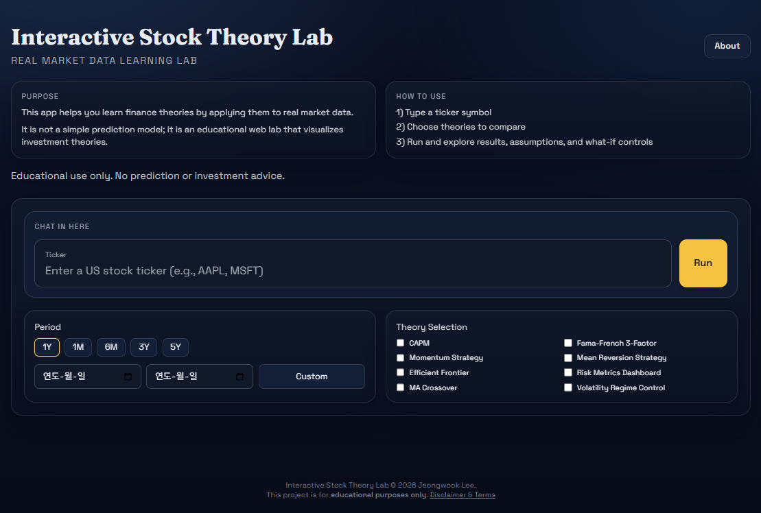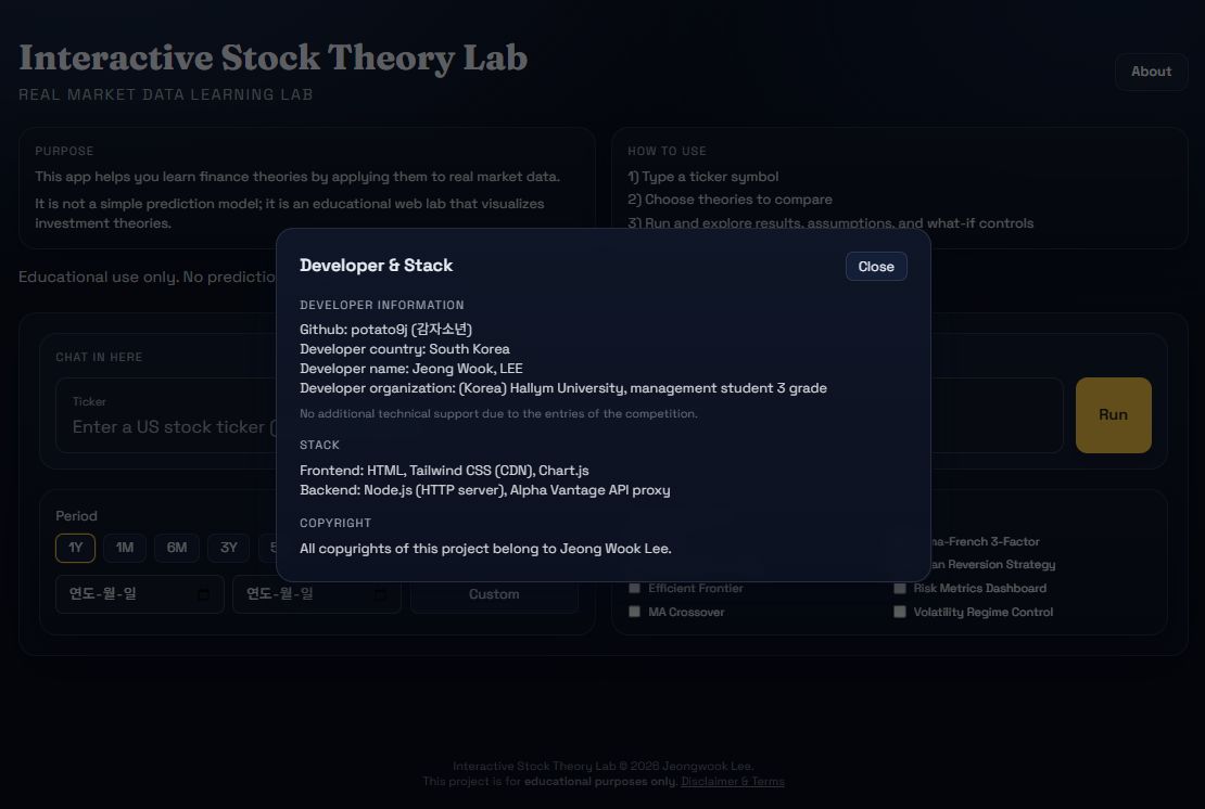 I am a third-year undergraduate student at Hallym University in South Korea, majoring in Business Administration with double majors in Finance and Big Data. When I studied finance, I focused on formulas and theory from financial engineering, but I struggled to understand how those ideas behave on real data. I believed there were many students like me, so I chose an educational web project to help learners move beyond theory-only study.