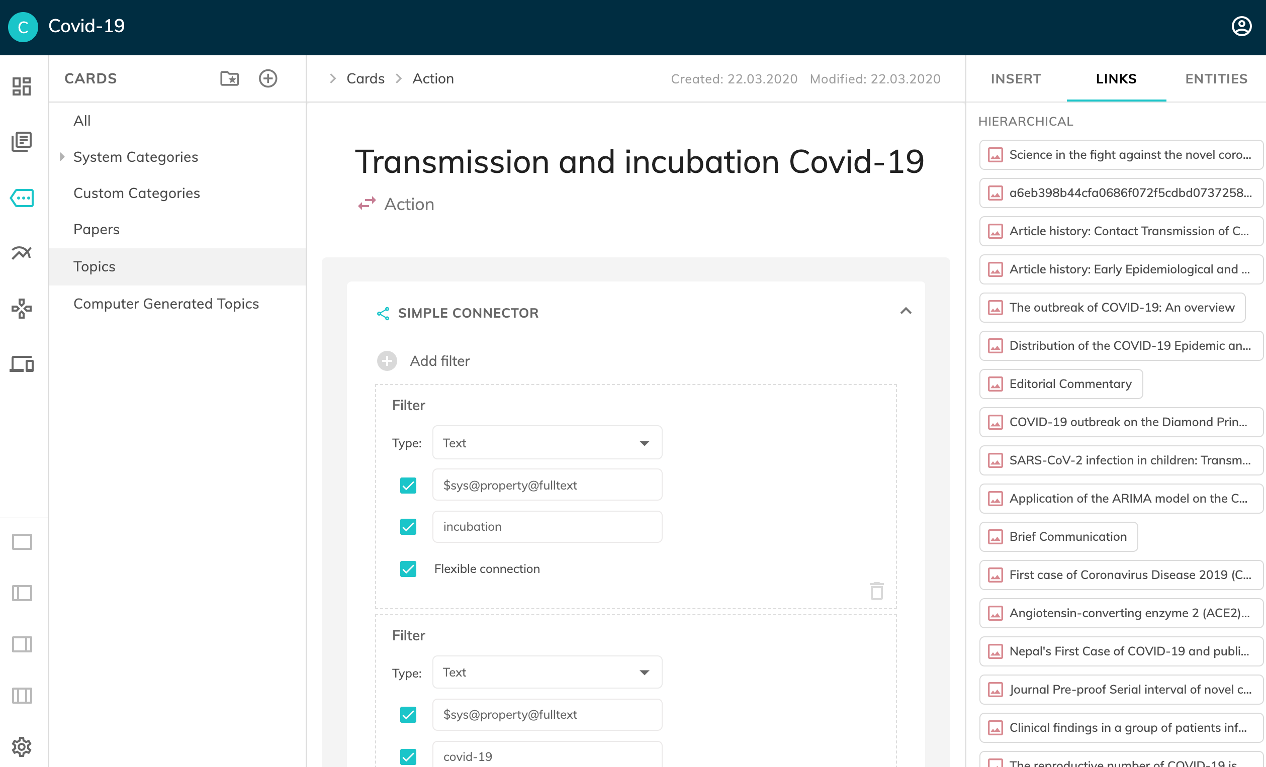 Users are also able to set their own topics. For instance, we have created a topic named: "vaccine for covid-19" and defined "vaccine" and "covid-19" as filters. Every new paper inserted into the platform that contain both terms is automatically linked to this topic. Other topics were also created: "transmission and incubation of covid-19", "risk factors for influenza pandemic", "medical care in case of covid-19", etc. (see slidehow pic. #4 - user defined topic).