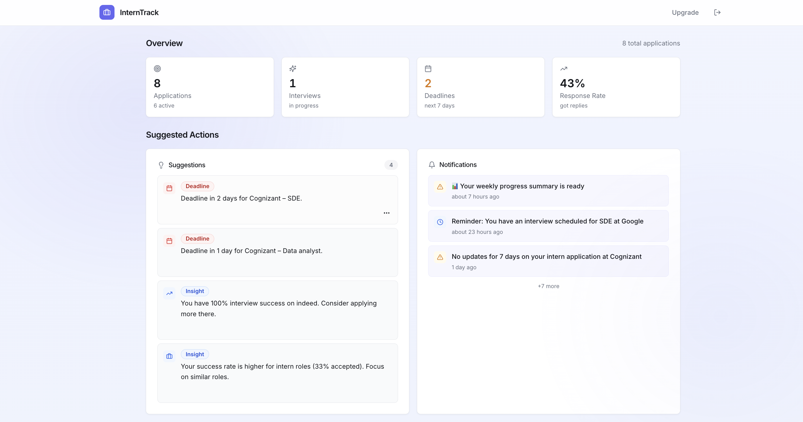 InternTrack was inspired by this chaos. We wanted to build a single, intelligent system that helps students organize, track, and improve their internship and job application journey - not just record data, but actively guide better decisions.