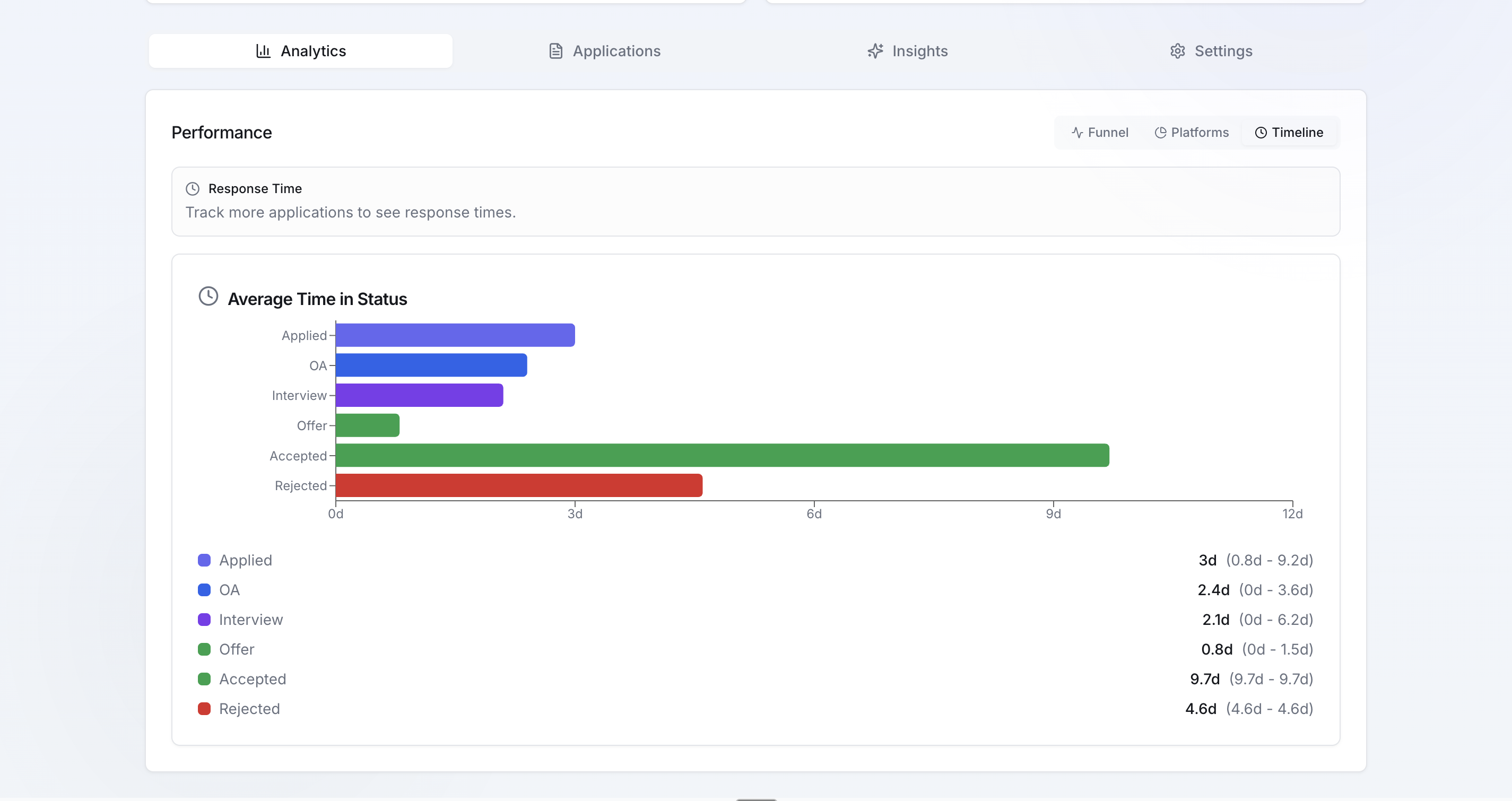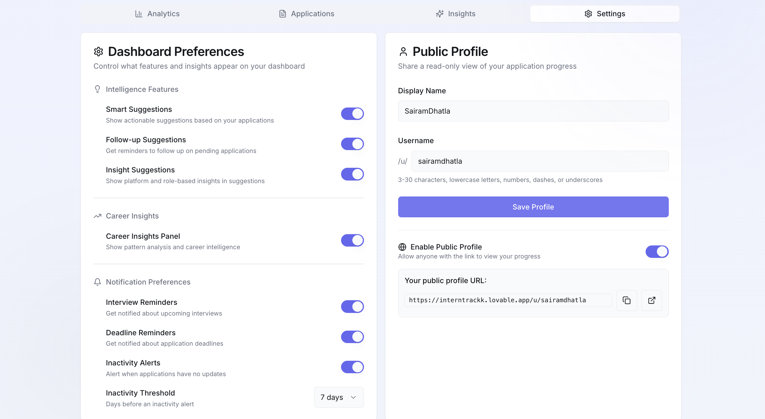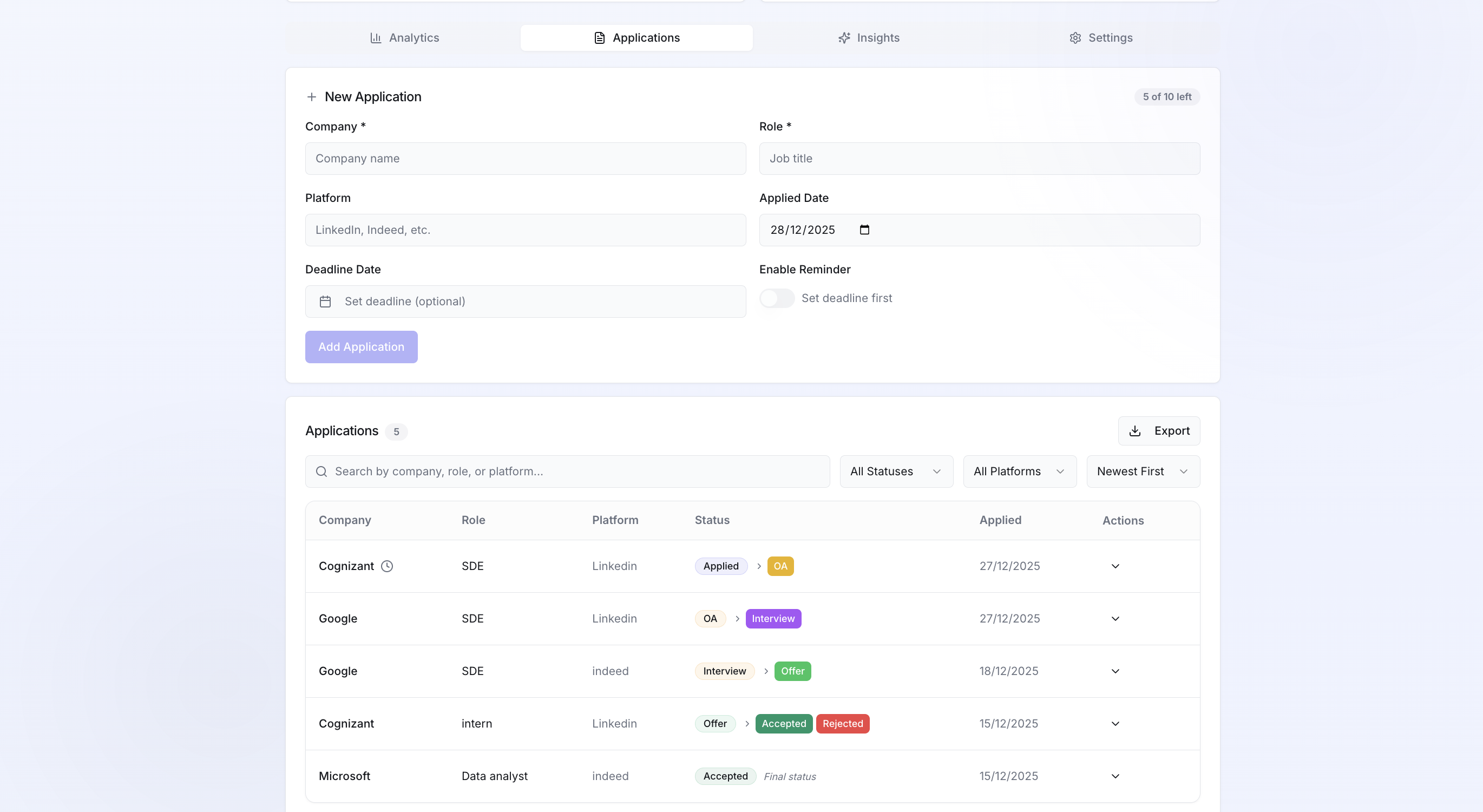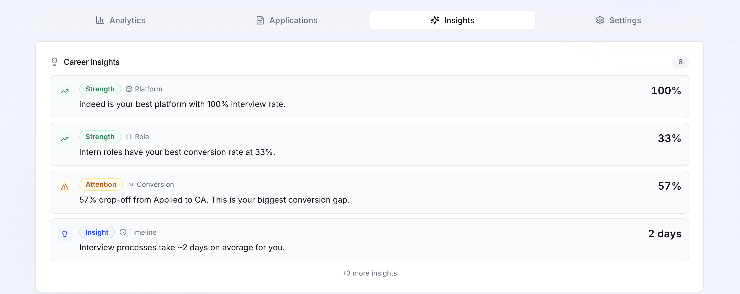 Beyond tracking, InternTrack analyzes user behavior and outcomes to provide actionable insights - helping students understand what platforms, roles, and strategies work best for them.